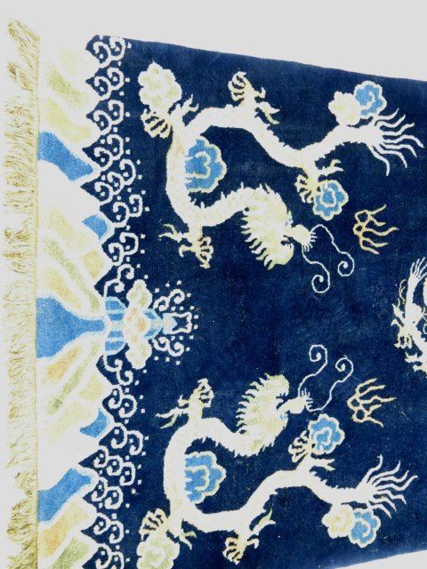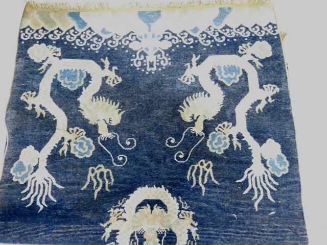 "5 Dragons", blue background. Approx. 3' x 5'. Good condition.