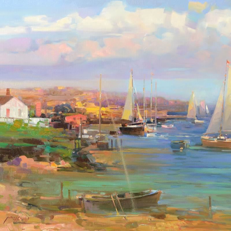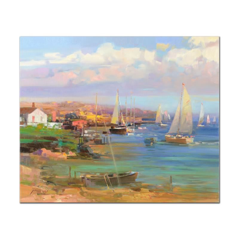 "Dawn" is an original oil painting on stretched canvas by Ming Feng, hand signed by the artist. Includes Letter of Authenticity. Measures approx. 24" x 20" (image).