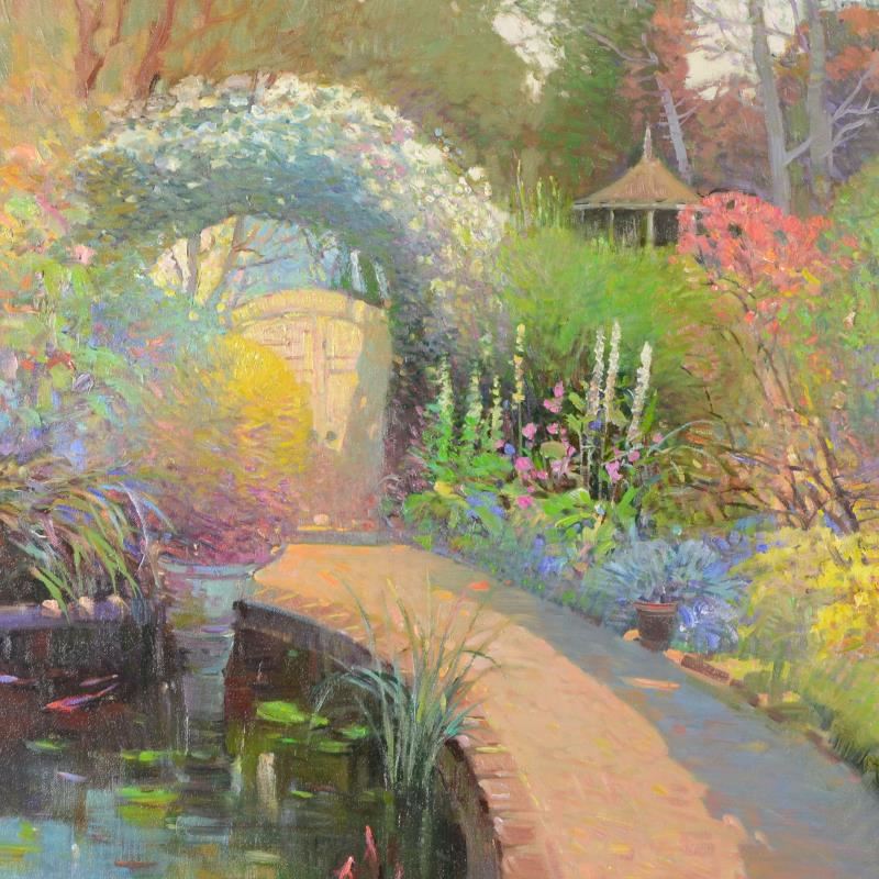 Ming Feng, "Koi Pond Garden" Original Oil Painting on Canvas, Hand Signed with L
