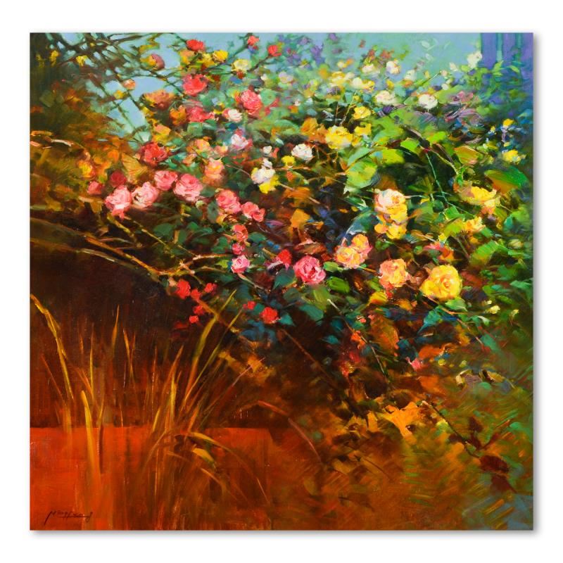 "Rambling Roses" is an original oil painting on stretched canvas by Ming Feng, hand signed by the artist. Includes Letter of Authenticity. Measures approx. 30" x 30" (image).