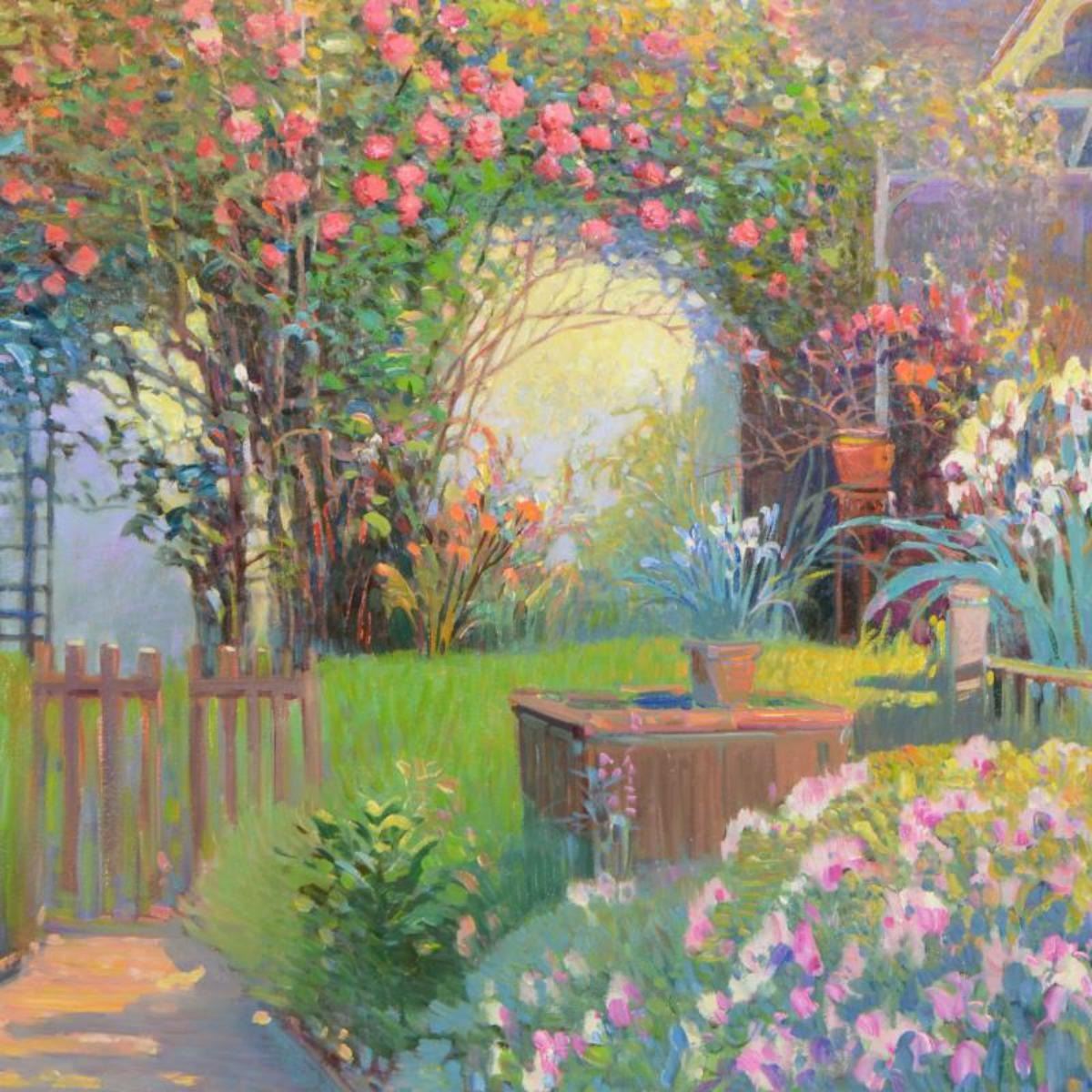 "Rose Garden" is an original oil painting on canvas by Ming Feng, hand signed by the artist. This piece comes framed. Includes Letter of Authenticity. Measures approx. 29.5" x 35.5" (frame), 23.5" x 29.5" (image). There is minor wear on the frame. Reference #: 239112