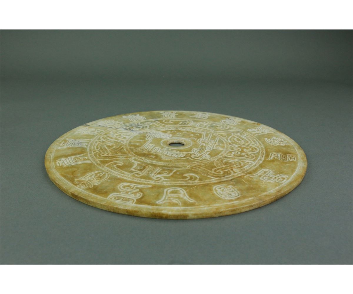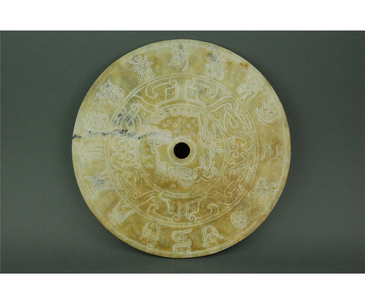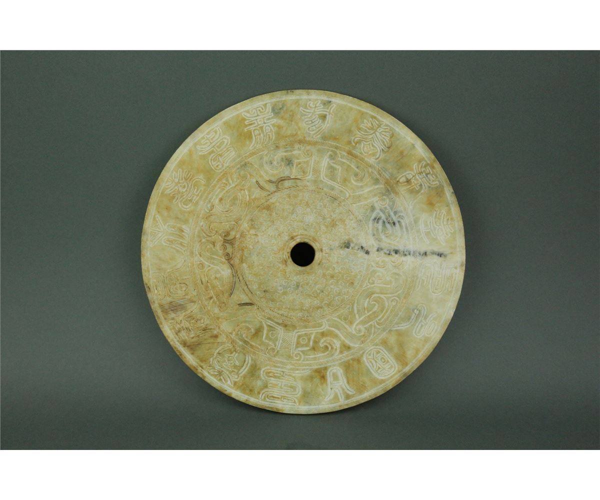 Chinese Ming period jade carved Bi Disk; featuring an outer band of ancient characters, with an inner band of archaistic pattern and landscape; with white opaque surface alternation; D: 27.5 cm, H: 0.5 cm 727 grams
