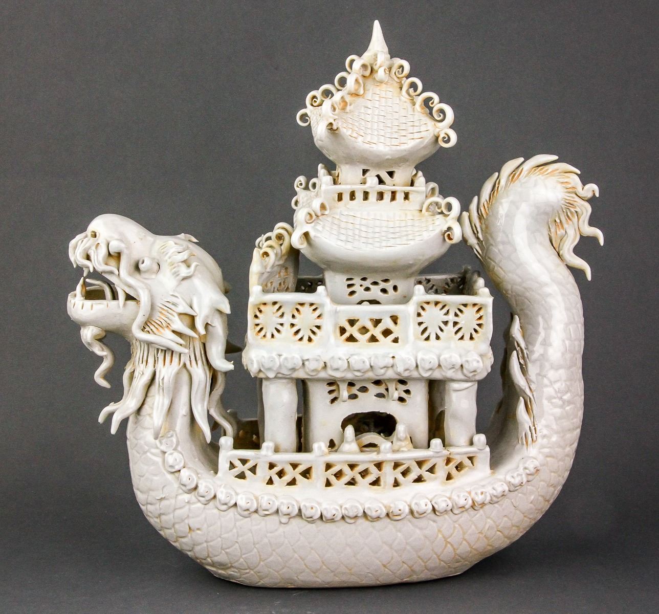 Chinese porcelain figure; in the form of a dragon boat carrying a three-level pagoda; covered in pale celadon glaze; H: 30.5 cm, W: 10 cm, L: 28 cm, 3014 grams