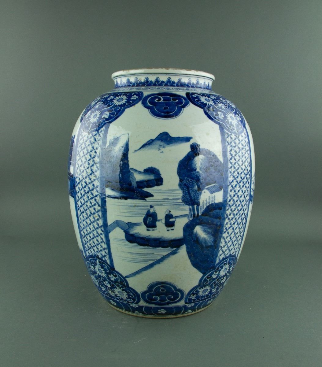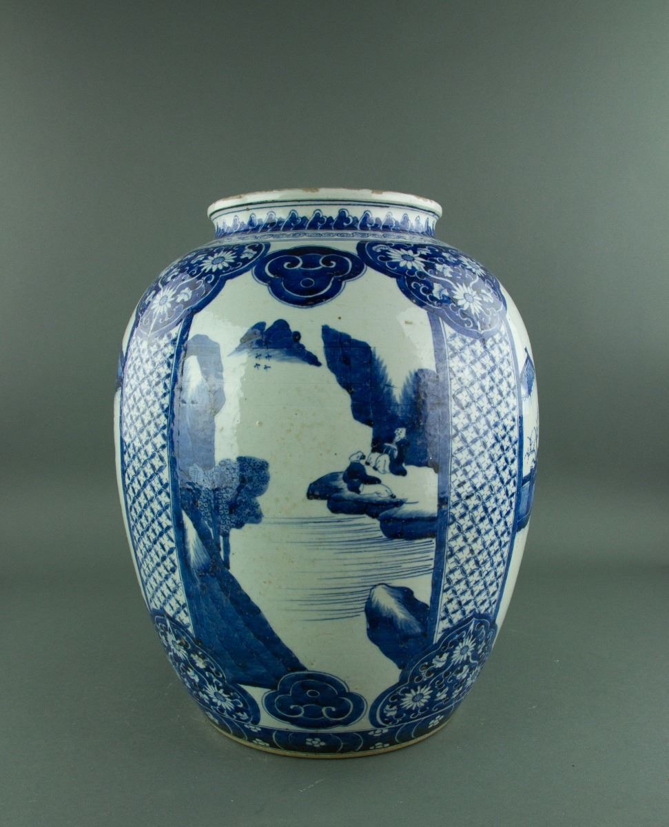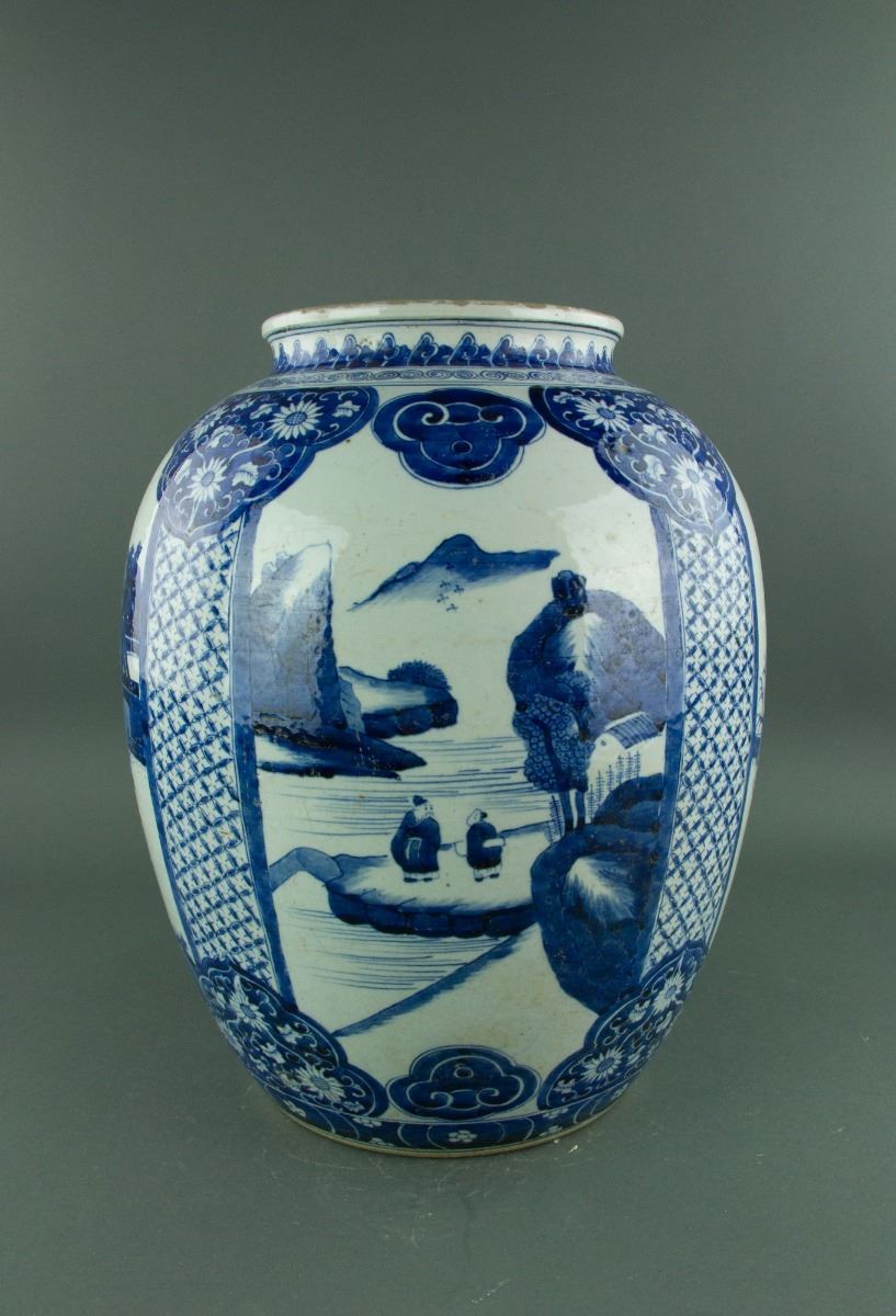 Chinese blue and white porcelain jar; Ming Wanli period; of ovoid body with lipped rim; painted with rectangular panels of figures and landscape; further decorated with ruyi-shaped panels of sunflower scrolls and cash-diaper ground; four-character Yu Tang Jia Qi mark in cobalt blue on the partially-glazed base with recessed centre; H: 44 cm, D: 29 cm, 8 kilograms