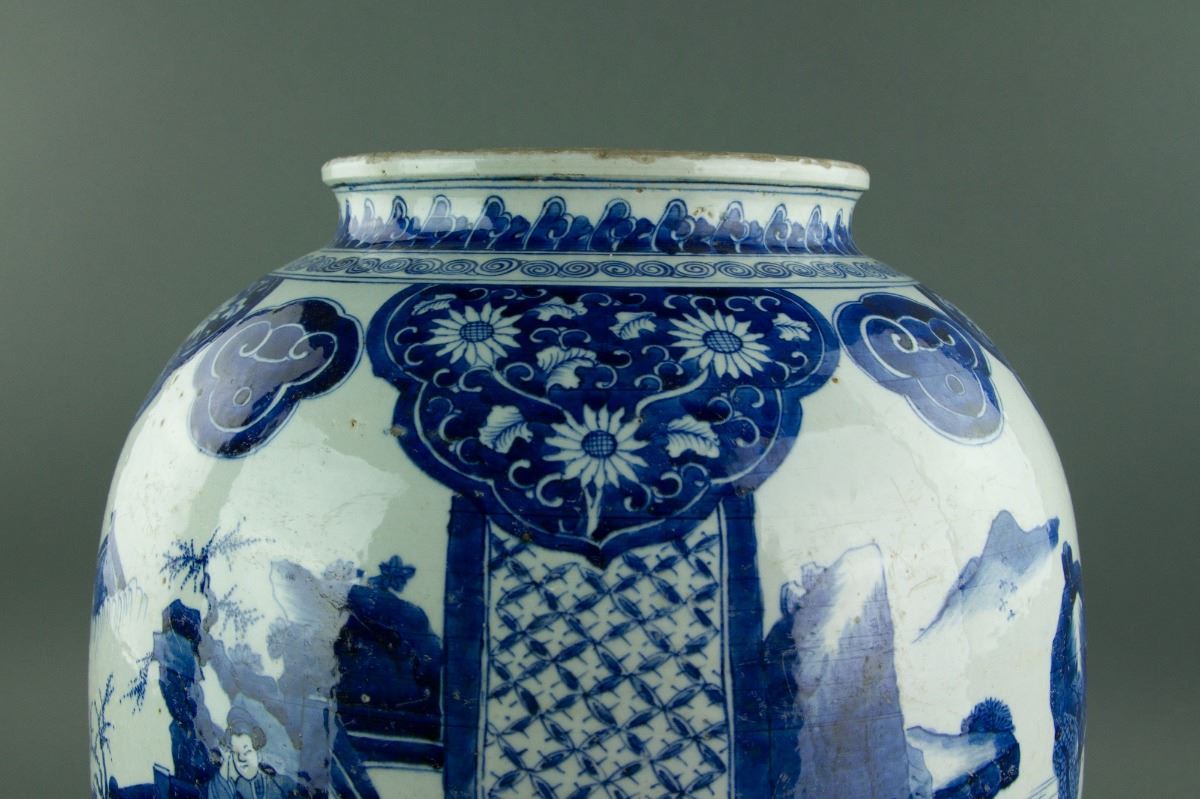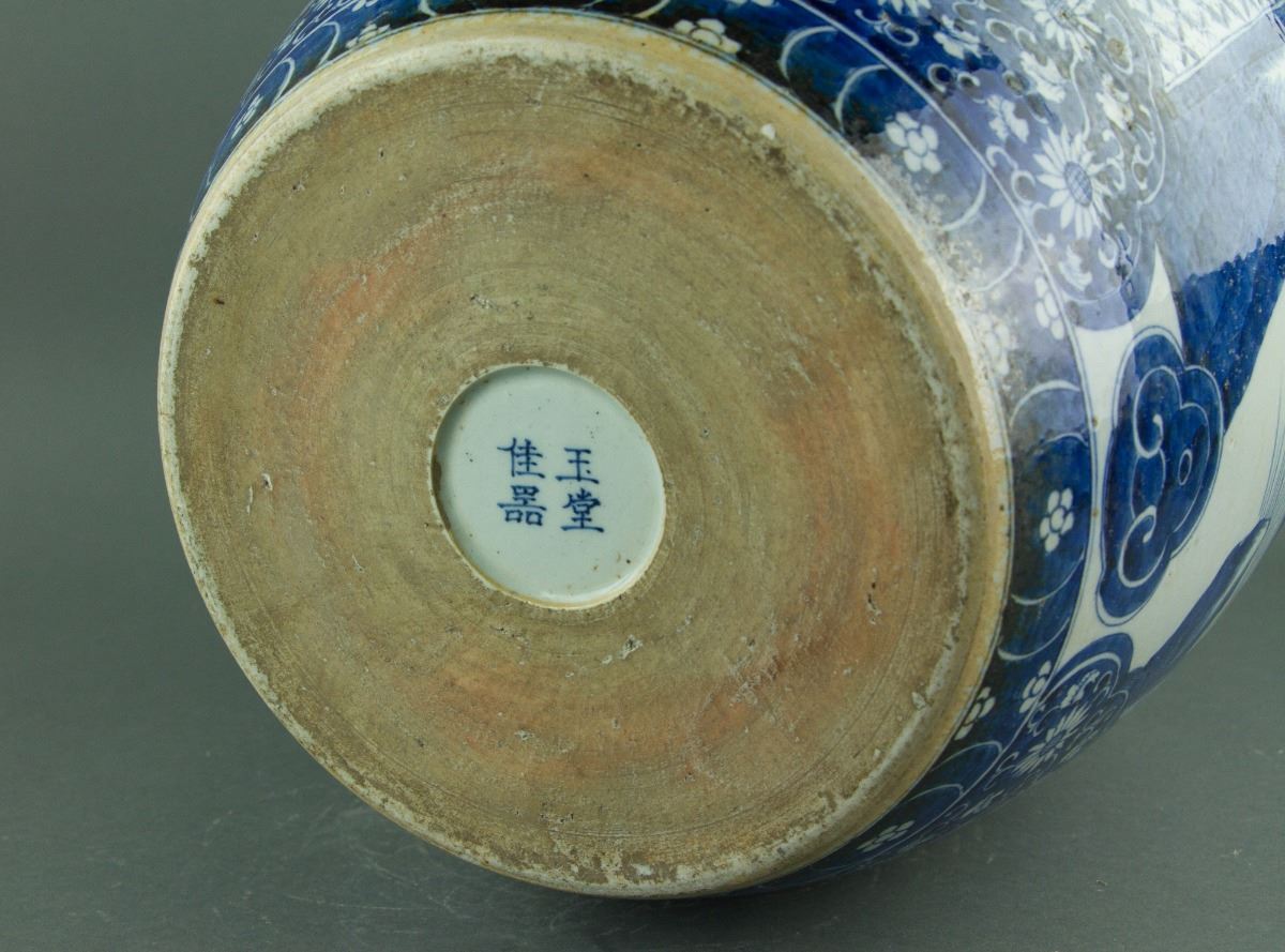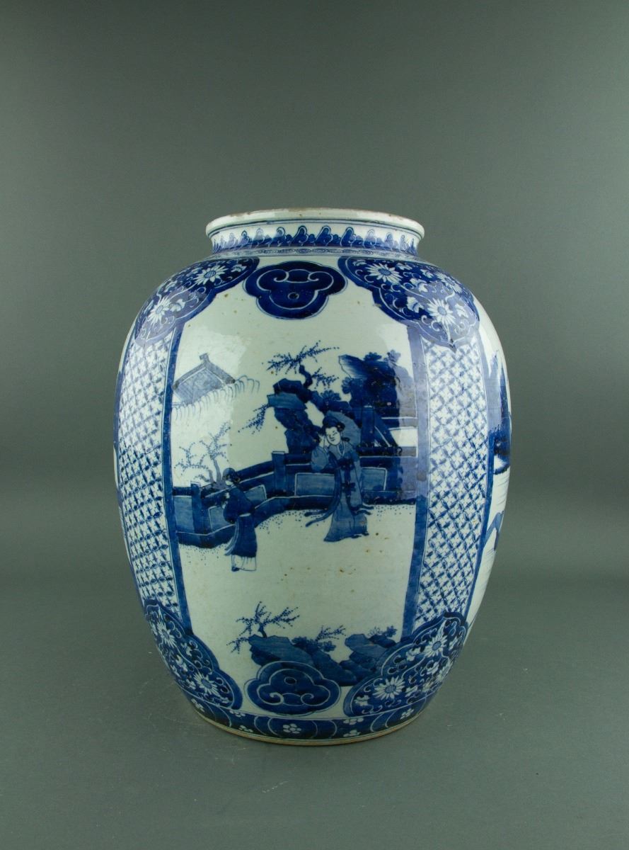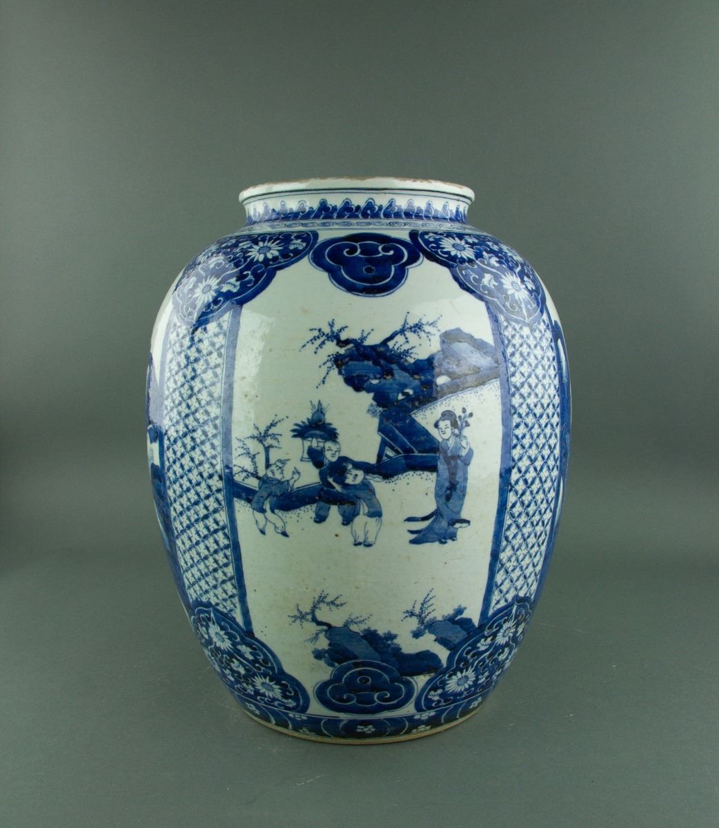 Chinese blue and white porcelain jar; Ming Wanli period; of ovoid body with lipped rim; painted with rectangular panels of figures and landscape; further decorated with ruyi-shaped panels of sunflower scrolls and cash-diaper ground; four-character Yu Tang Jia Qi mark in cobalt blue on the partially-glazed base with recessed centre; H: 44 cm, D: 29 cm, 8 kilograms