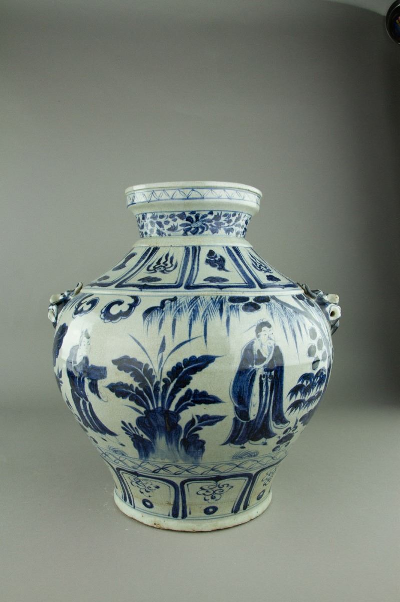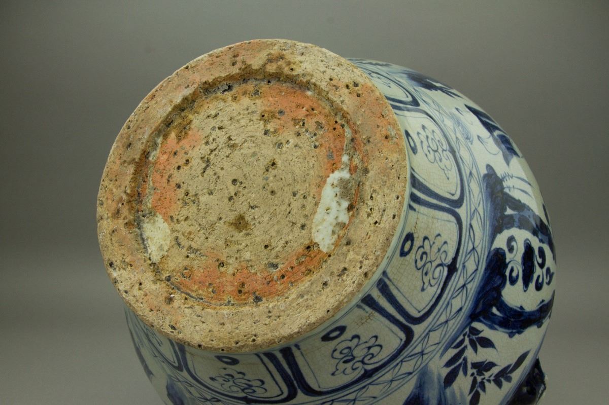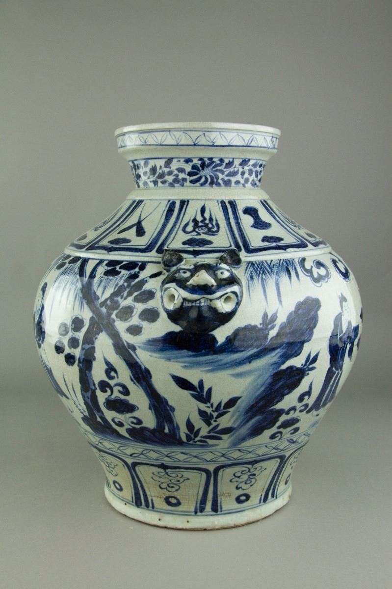 Yuan or Ming style blue and white porcelain jar; of globular body tapering the base; flanked by double tiger-shaped handles; decorated with figures and landscape; unglazed base; H: 40 cm, W: 36 cm, 5.5 kilograms