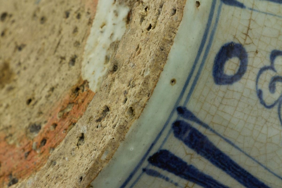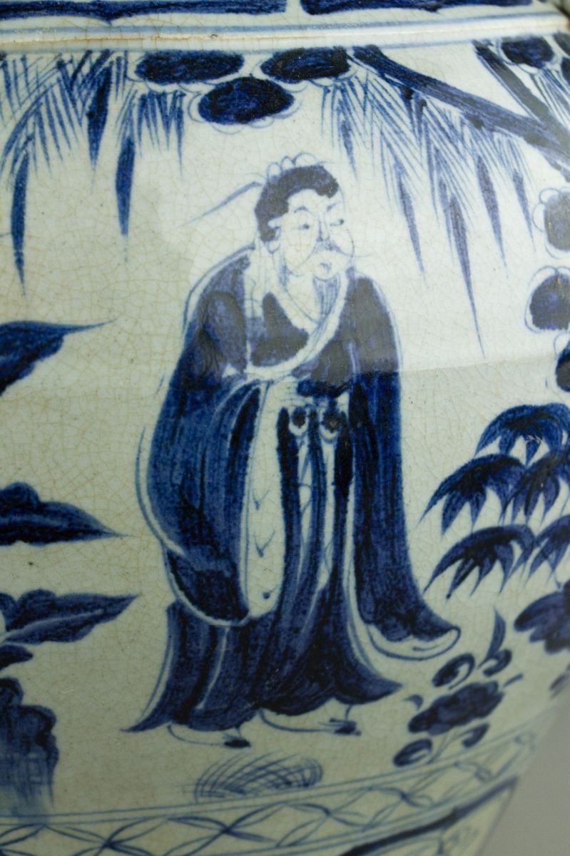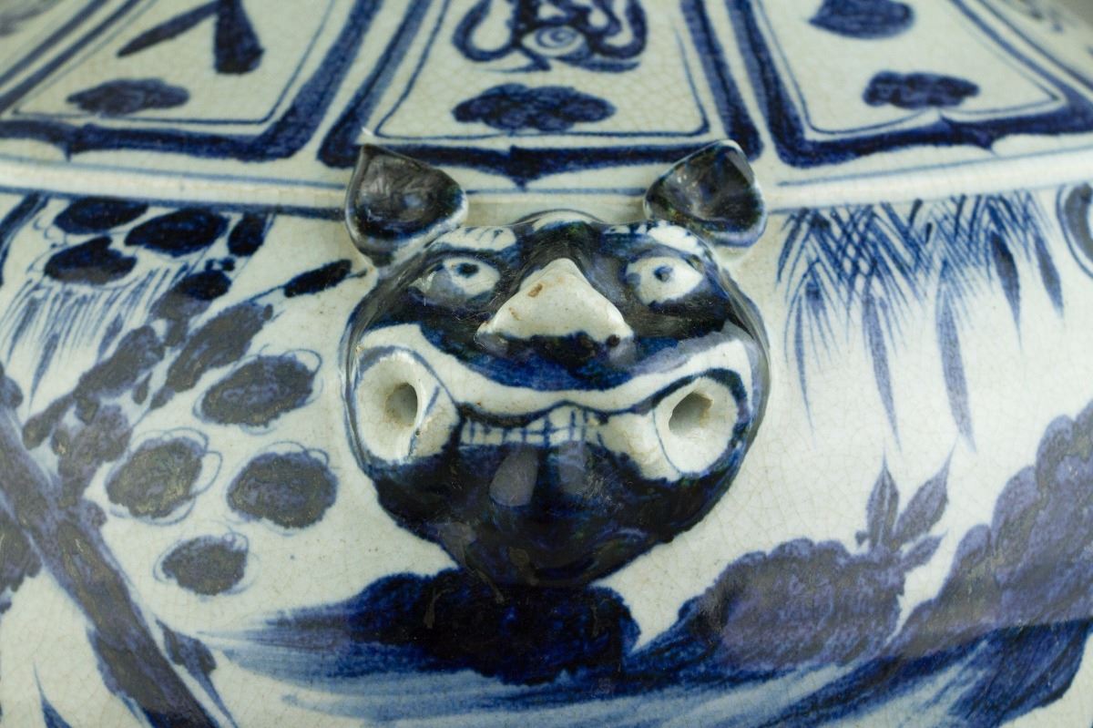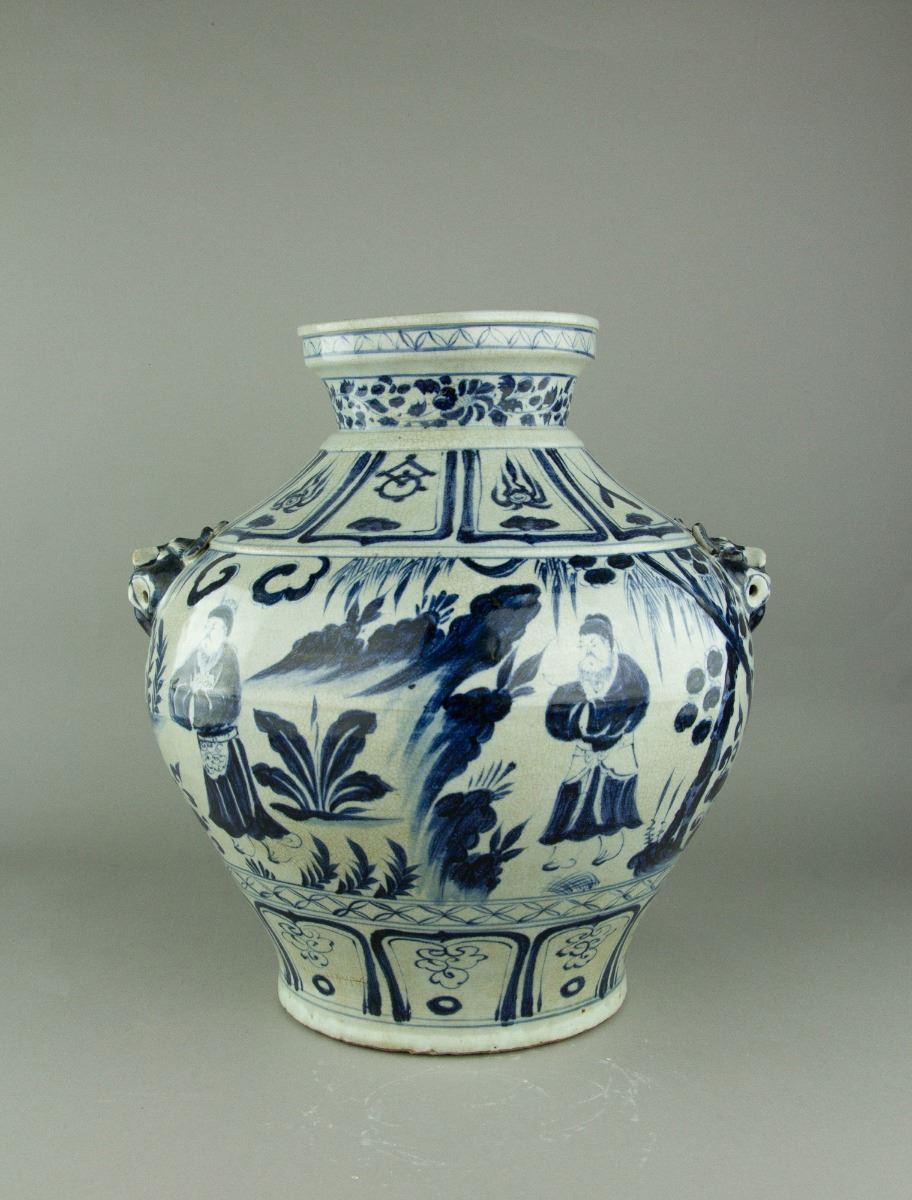 Yuan or Ming style blue and white porcelain jar; of globular body tapering the base; flanked by double tiger-shaped handles; decorated with figures and landscape; unglazed base; H: 40 cm, W: 36 cm, 5.5 kilograms