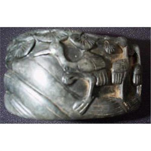 15th.-16th. century Chinese scholar prized ink wash basin with side carving design featuring cranes. It is intact, black color with hallowed container space used to wash the brushes. Dimensions: 3.5 inches length, 2.5 inches width, 2 inches height. Provenance: Dr. Veleanu's jade collection, the author of the collectors textbook: "Jade, 5000 BC to 1912, Guide to collectors" and the owner of Objets d'Art Uniques Internet store. The retail value for this antique jade carving is well above $1000!.
