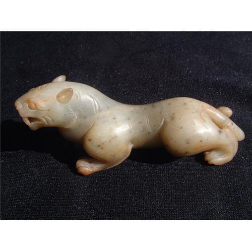 Ming period celadon jade carving in shape of tiger. The tiger represents the west cardinal point and the tiger is the symbol of power on earth. This is a homogeneous, inclusions free celadon jade carving. Length: 5.1" (13 cm.), width: 2" (5 cm.). Estimated market value: $7.000. From Dr. Veleanu's collection, the renown author of the collectors' textbook: "Jade, 5000 BC to 1912 AD, Guide to collectors".