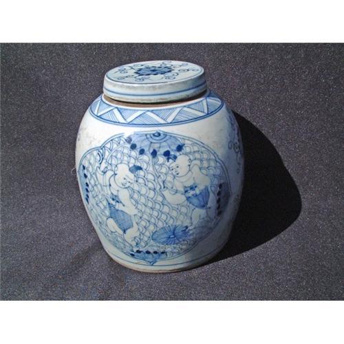 Exquisite Ming period ginger jar with blue and white underglaze decorations in 2 panels featuring 2 children playing with kites. The design alternates with lotus flowers and vine tendrils. The lid is decorated with matching lotus flowers and vine tendrils. 2 blue double rings decorate the base. Height: 7.5" (19 cm.). Diameter at bottom: 5.5" (14 cm.).