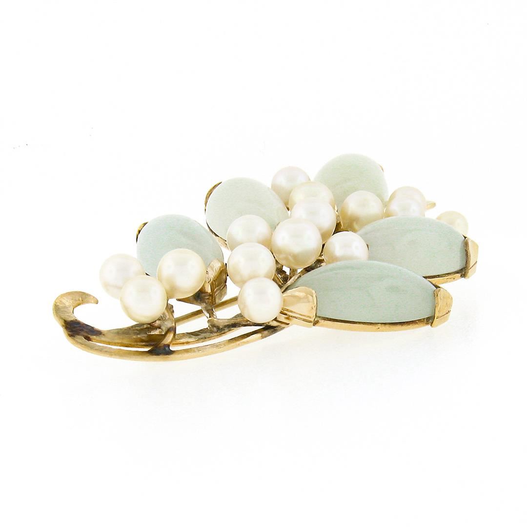 A solid 14k yellow gold pin brooch by Ming's, featuring 5 marquise cabochon cut natural jade (15.9x7.9mm each), and 15 round shape cultured pearls (3.6 to 4.9mm each). Measures 33x54.70mm and weighs a total of 13.42 grams.