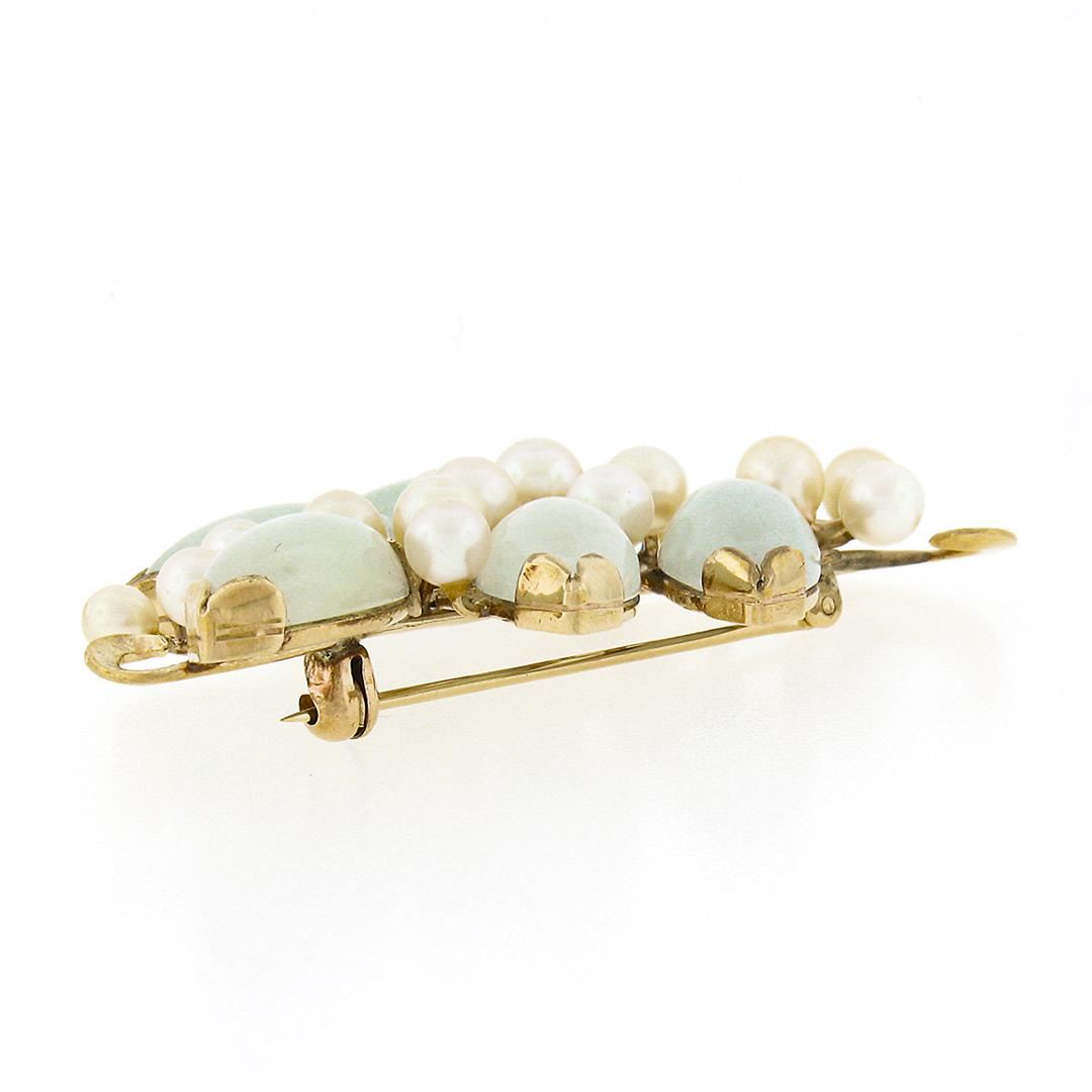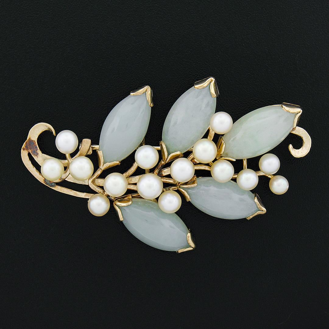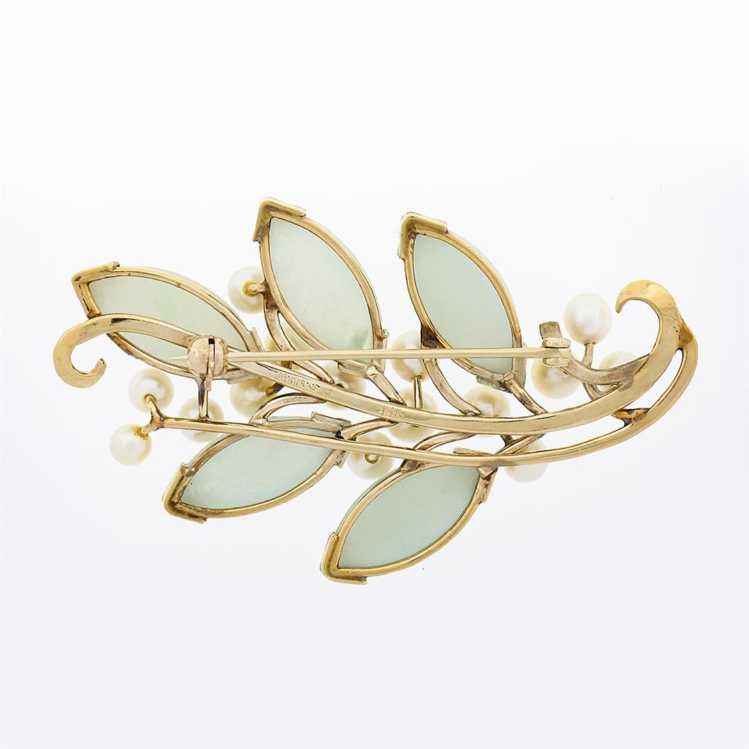 A solid 14k yellow gold pin brooch by Ming's, featuring 5 marquise cabochon cut natural jade (15.9x7.9mm each), and 15 round shape cultured pearls (3.6 to 4.9mm each). Measures 33x54.70mm and weighs a total of 13.42 grams.