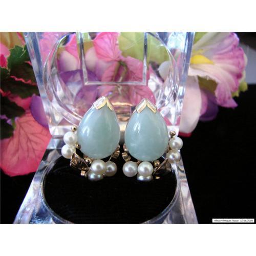 Ming's Honolulu 14k Jade and Pearl clipback earrings. Measures 1" by 3/4". Pearls are 6mm. UNSIGNED but has all the typical Ming's Honolulu design elements.