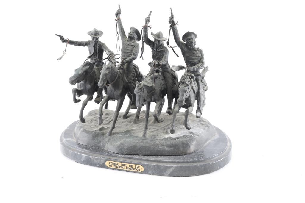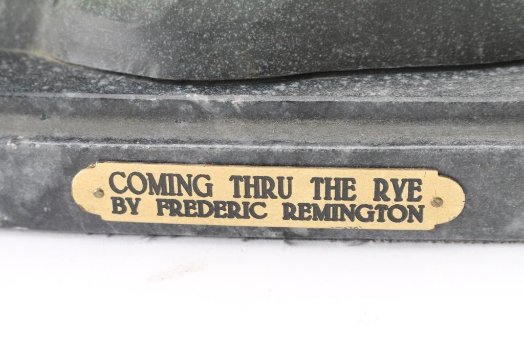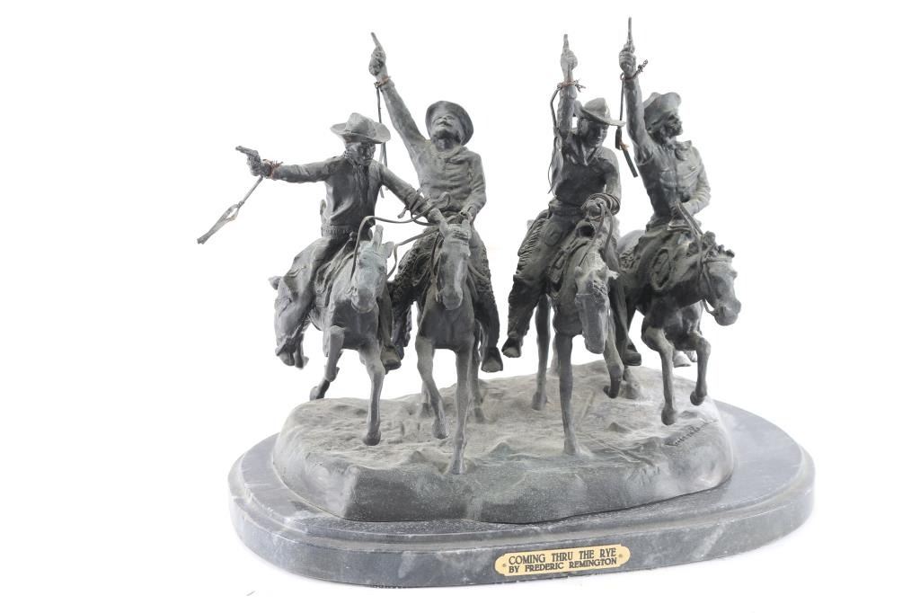 Measures 14" tall by 16" across and 10" deep. On green marble base, entitled "Coming Through the Rye".