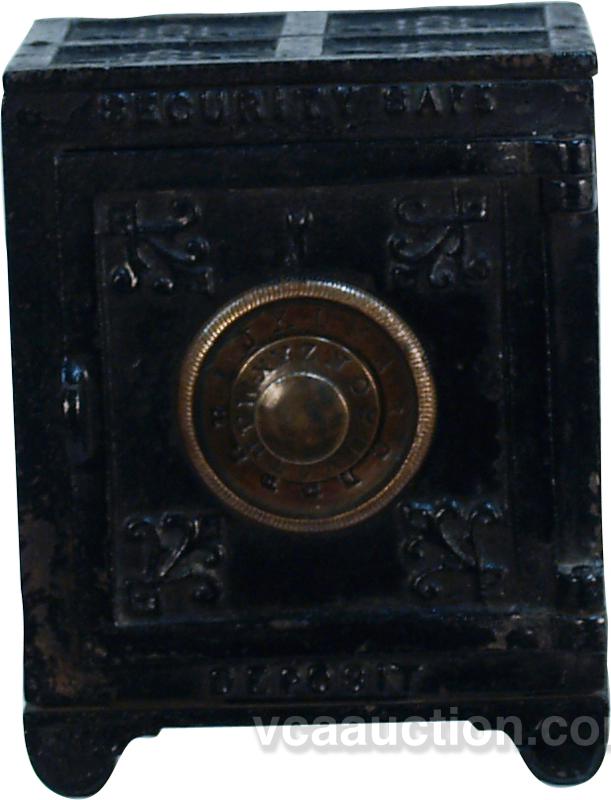 Mini Countertop Cast-Iron Security Safe Deposit Safe Bank pat. Feb. 15. 81 & Mar. 1. 87 - 4" x 4" x 5" tall