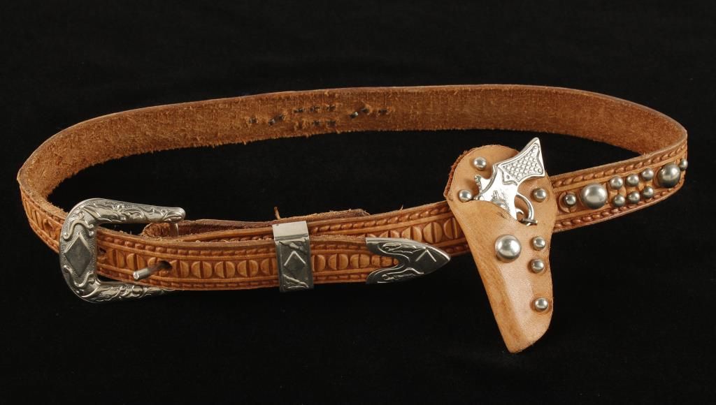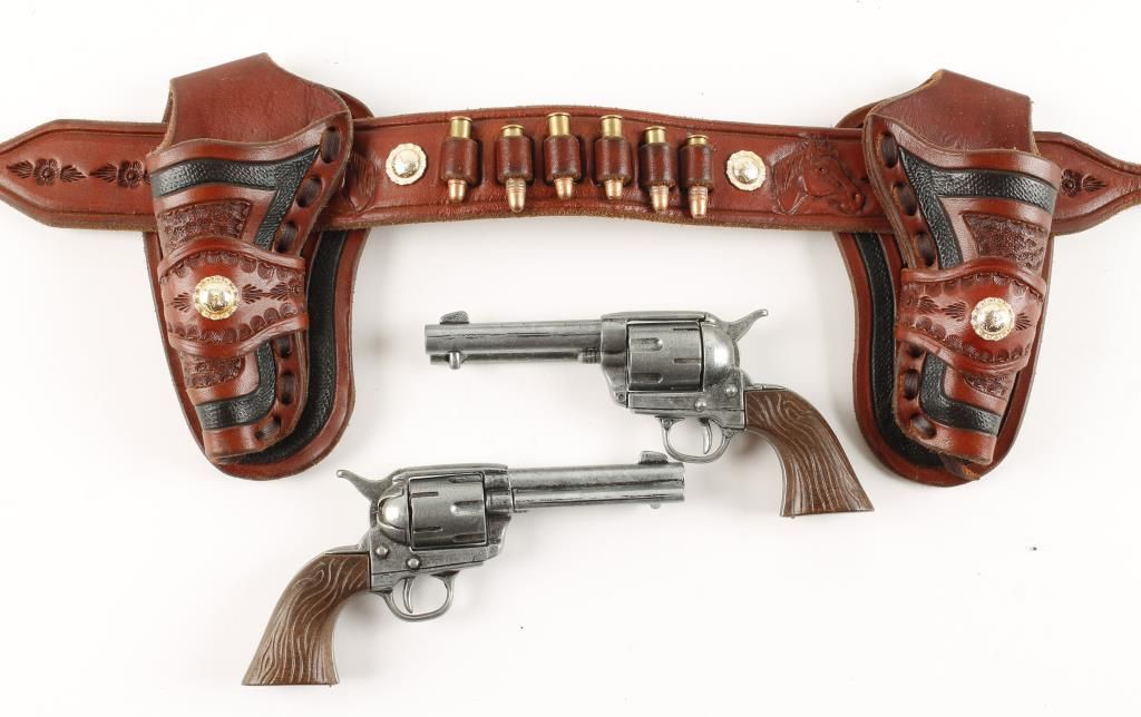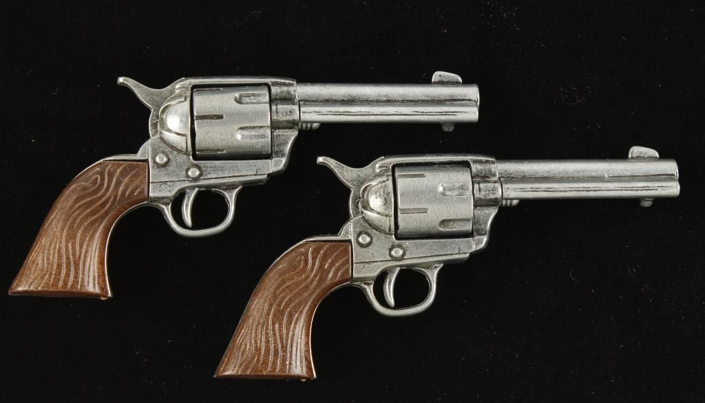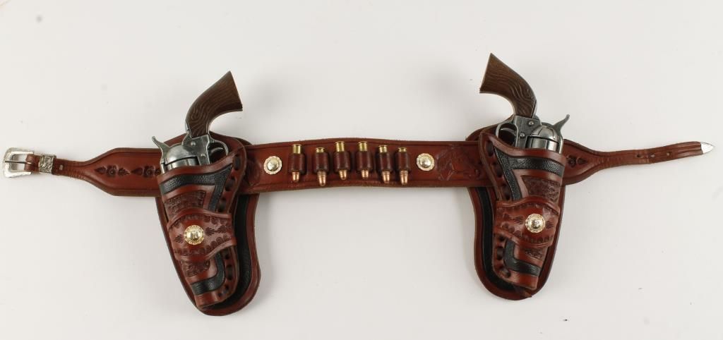 Includes (2) Miniature non-firing replica revolvers, single action. Approx 5" long. (1) Miniature double holster rig, brown leather construction stamped "J.J. Croft Maker Deadwood S.D." Also includes (1) Small belt, stamped "20" with decorative holster and fun figurine.