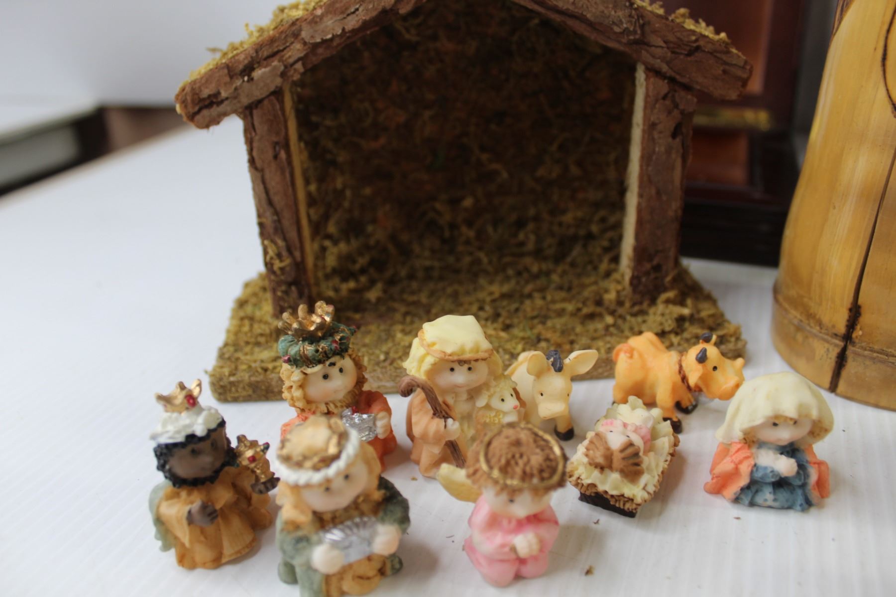 Mini Figurine Manger Set 7" x 5.5" x 3", (4) Glass Candle Holders, Glass Vase 5.75" Tall, (5) Fancy