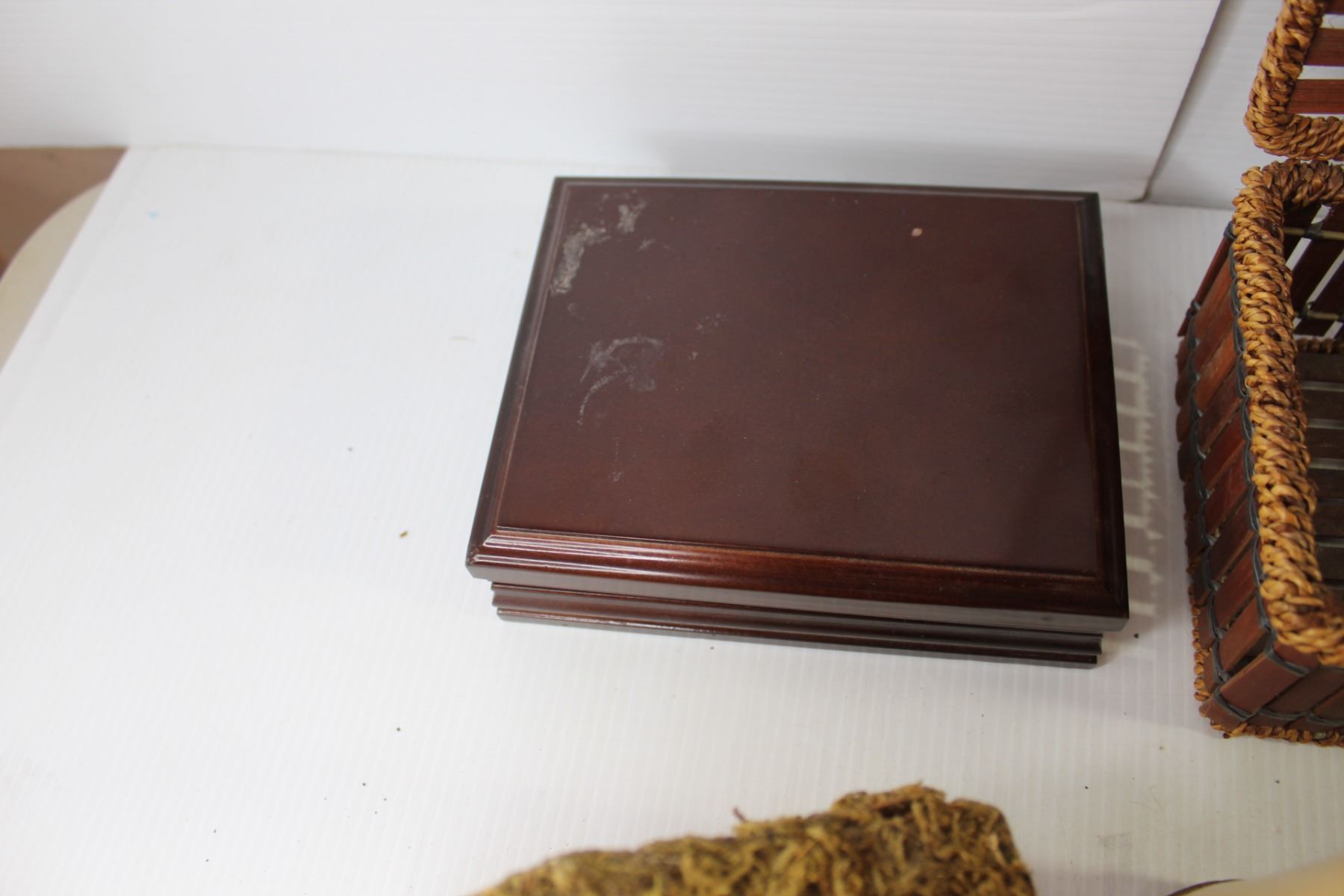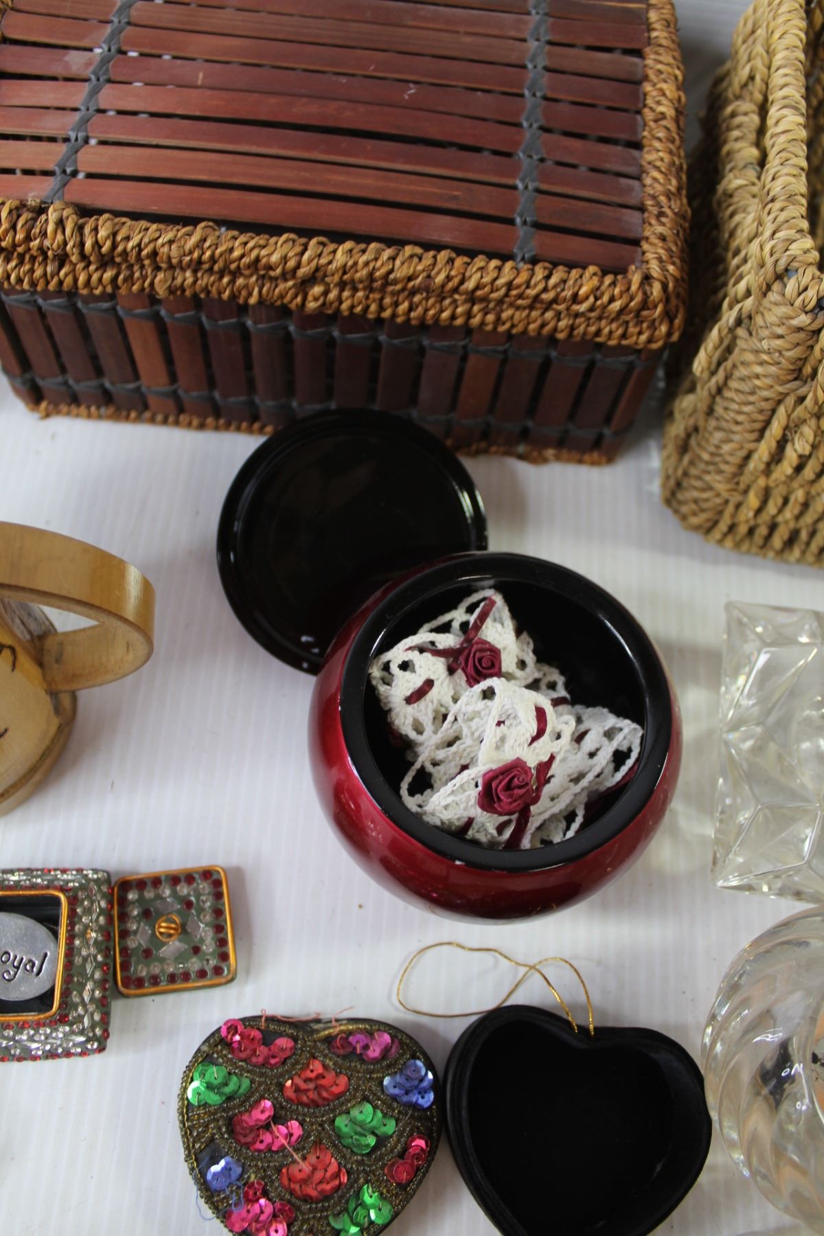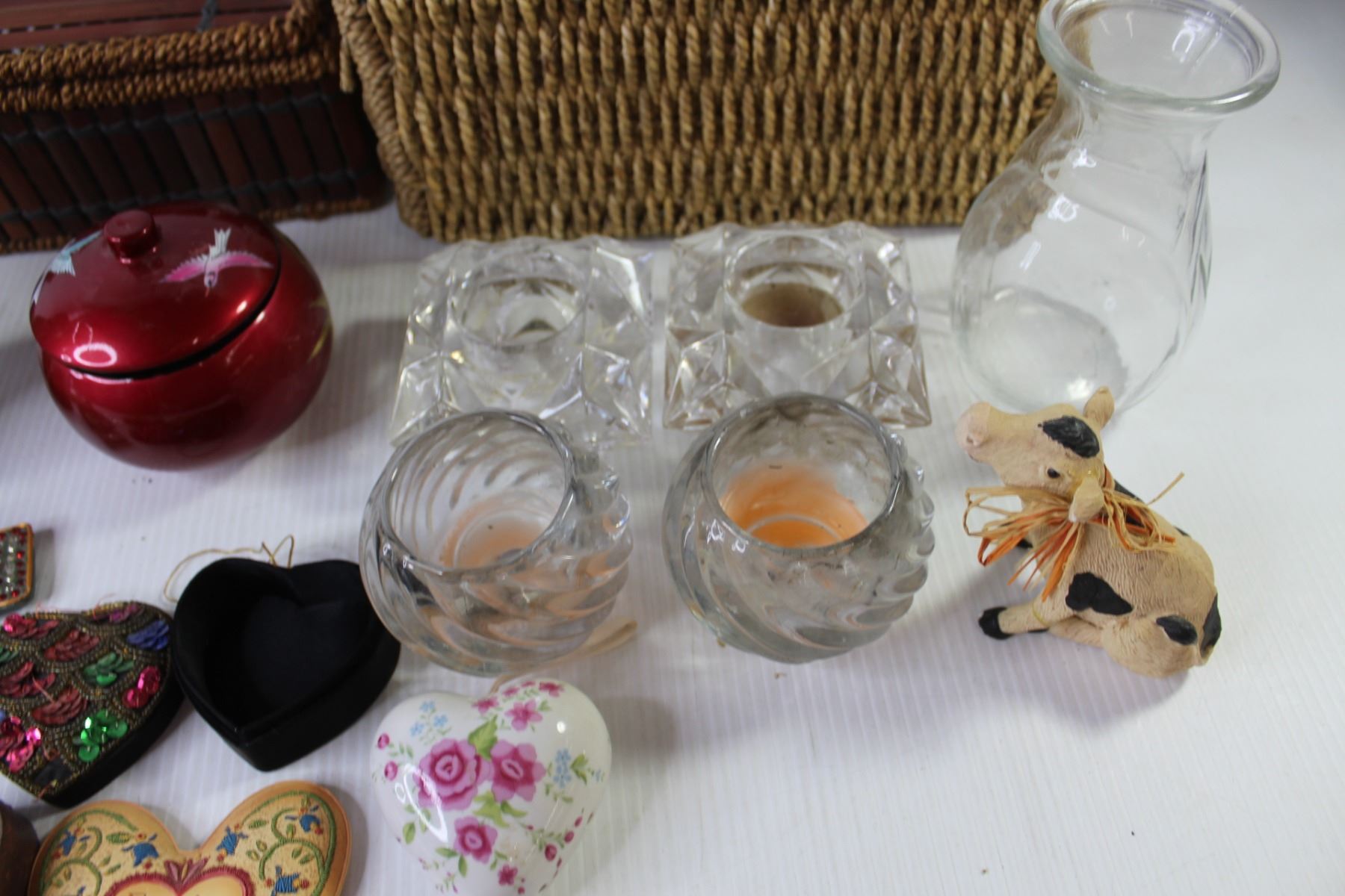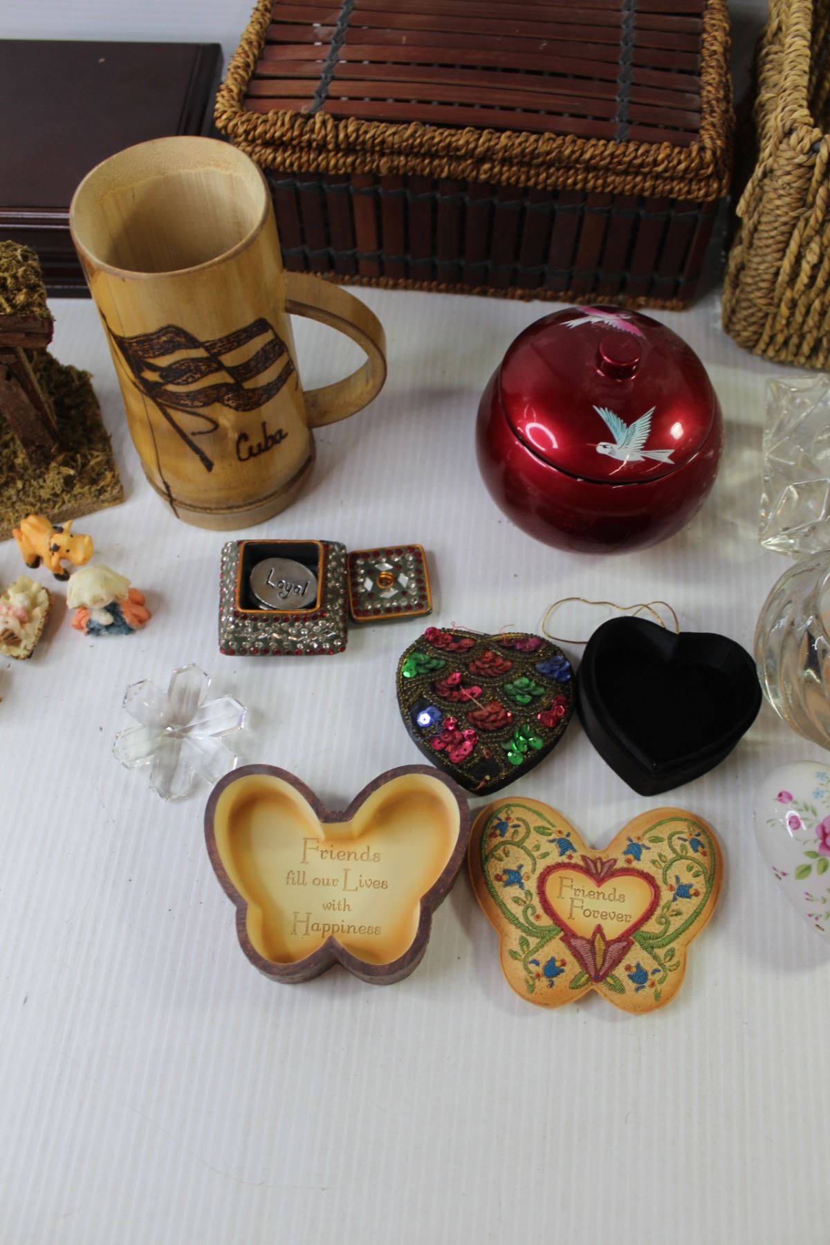 Mini Figurine Manger Set 7" x 5.5" x 3", (4) Glass Candle Holders, Glass Vase 5.75" Tall, (5) Fancy Trinket Boxes, (2) Wicker Baskets 11" x 6.5" x 5" and 9" x 5.5" x 4", Rubber Pig Ornament, Potpourri Diffuser, Misc.