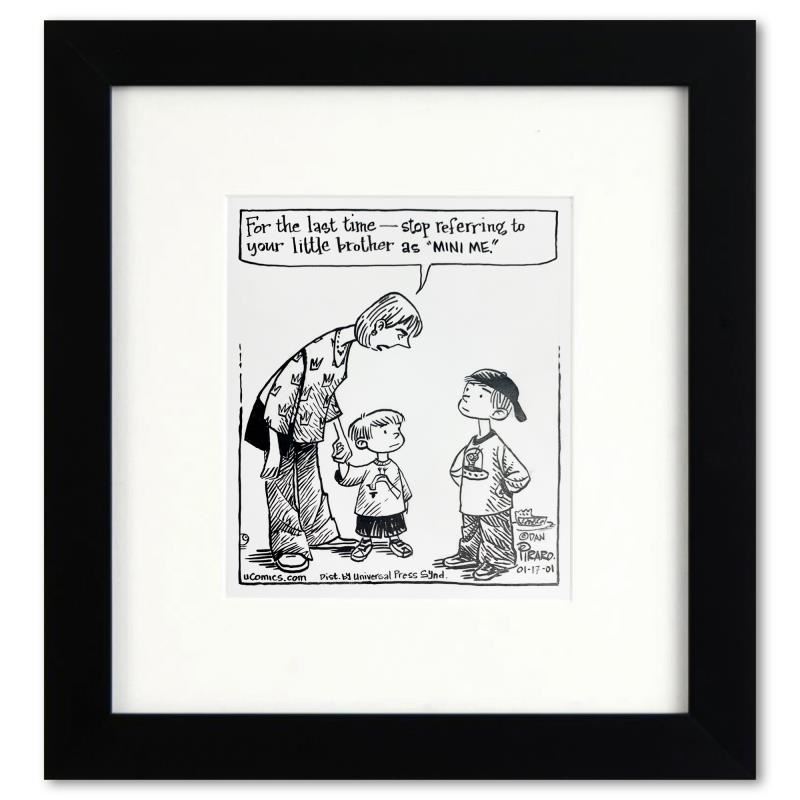Enter a surreal and satirical world of twisted imagination and award winning creativity. "Mini Me Brother" is an original pen & ink drawing on paper by Dan Piraro, creator of the critically acclaimed and award winning comic strip, Bizarro. This piece is hand signed, comes custom framed and includes a letter of authenticity. Measures approximately 12" x 11" (frame), 7" x 6" (image).This item requires special handling and may have a longer than usual turnaround.