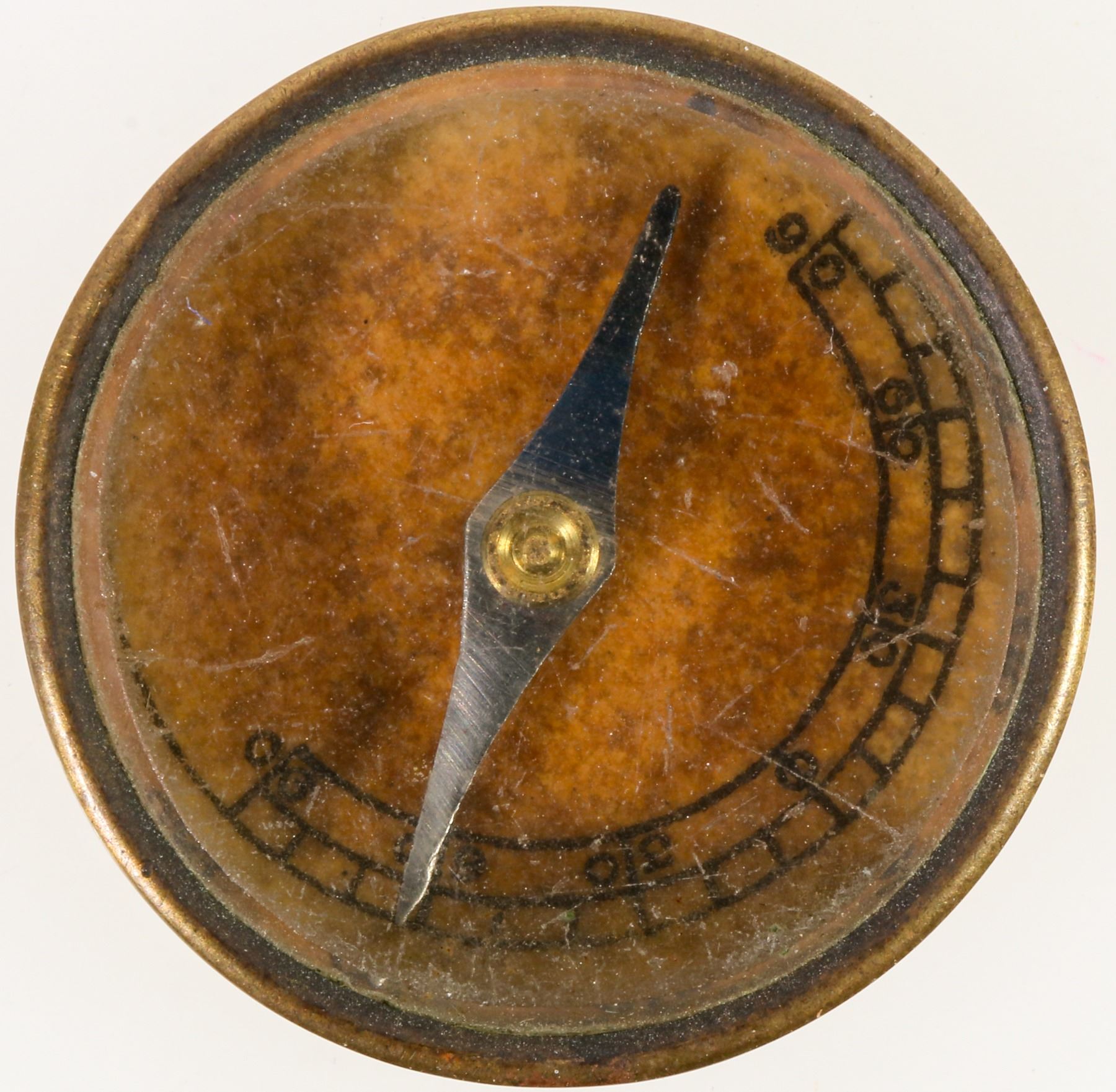 There is no maker's mark on this little gem. It reads 90-0-90 degrees across the bottom of the compass similar to a miner's compass. Pocket ready at .875 inches. in diameter. Please see photo for details.