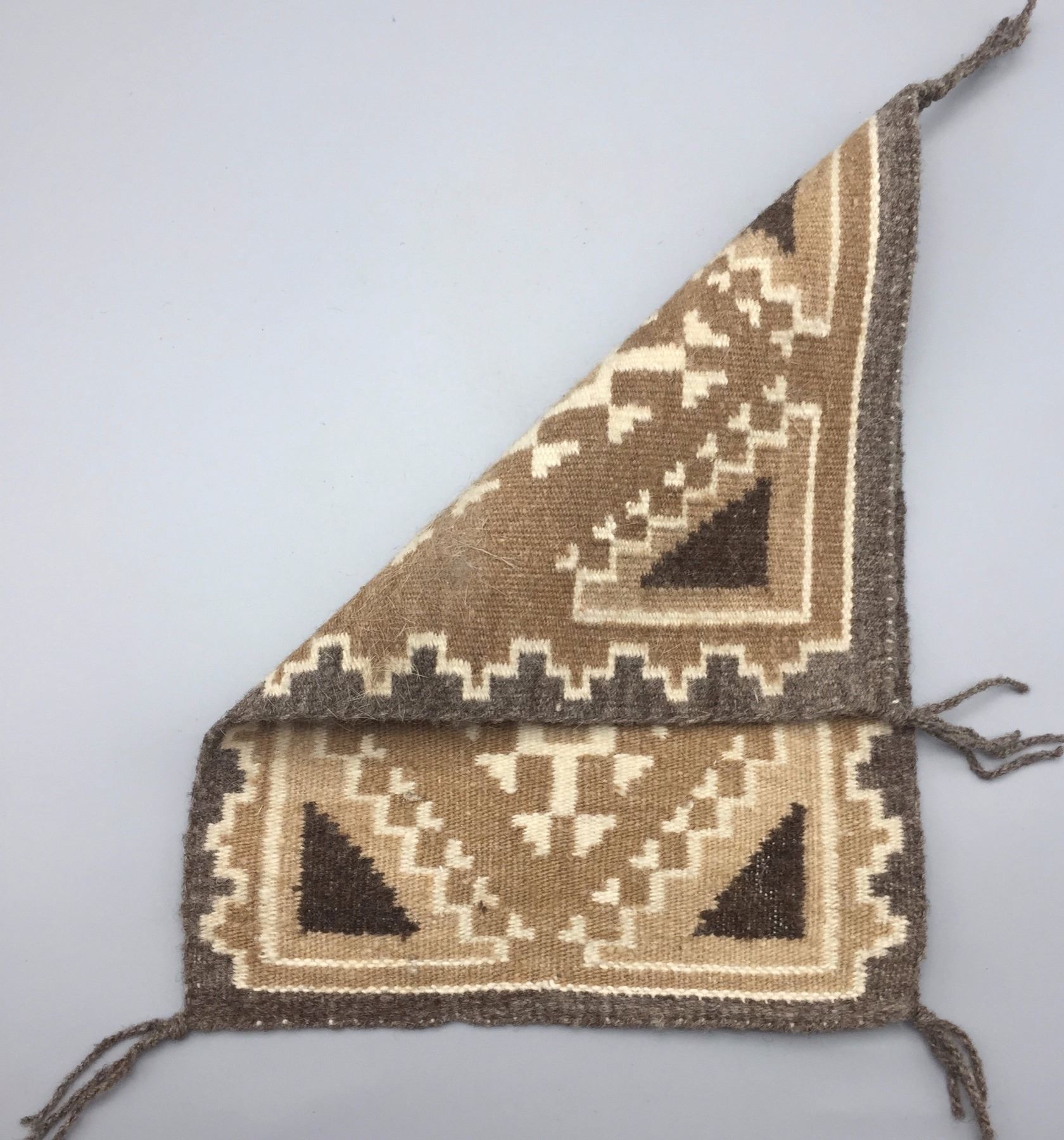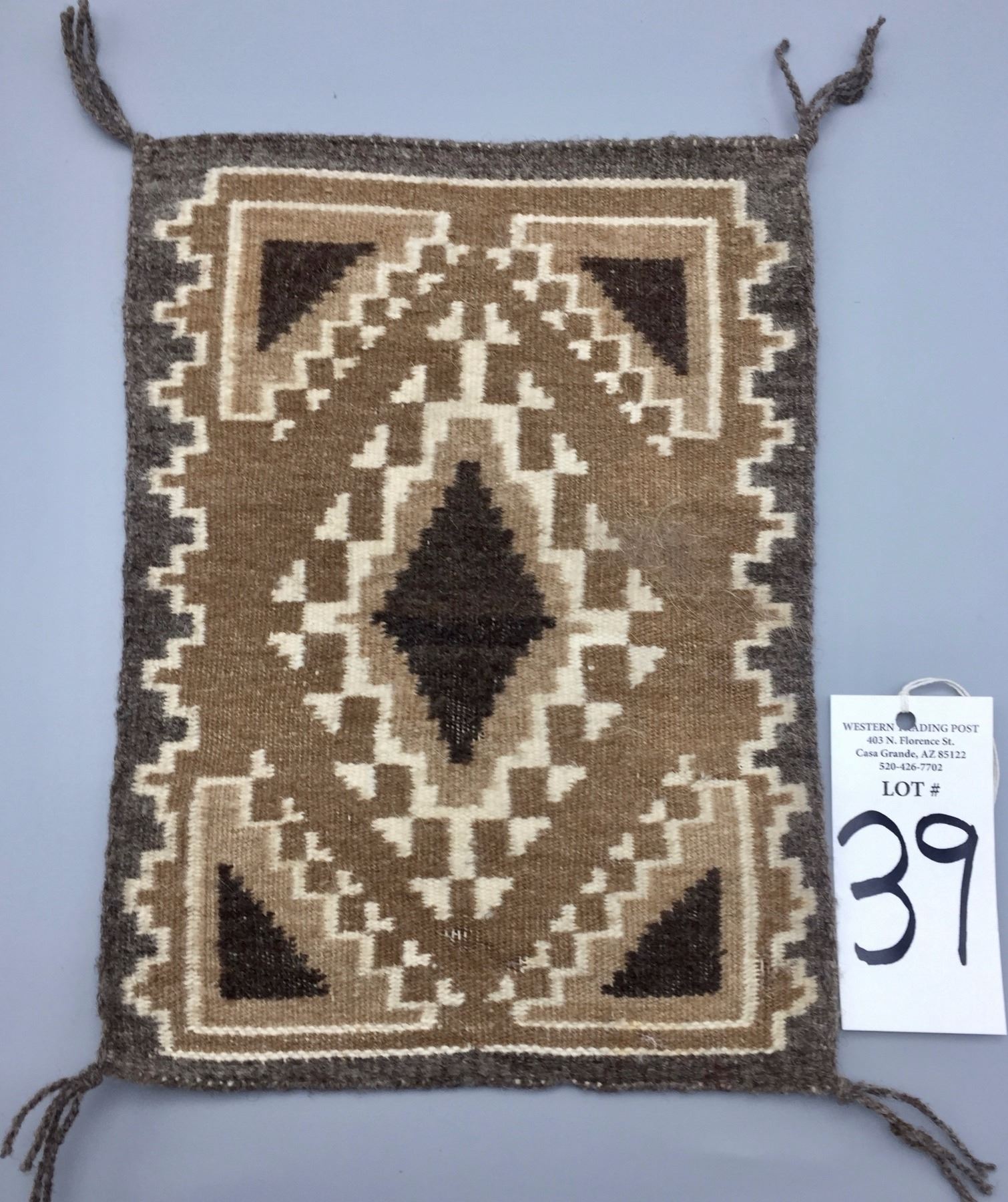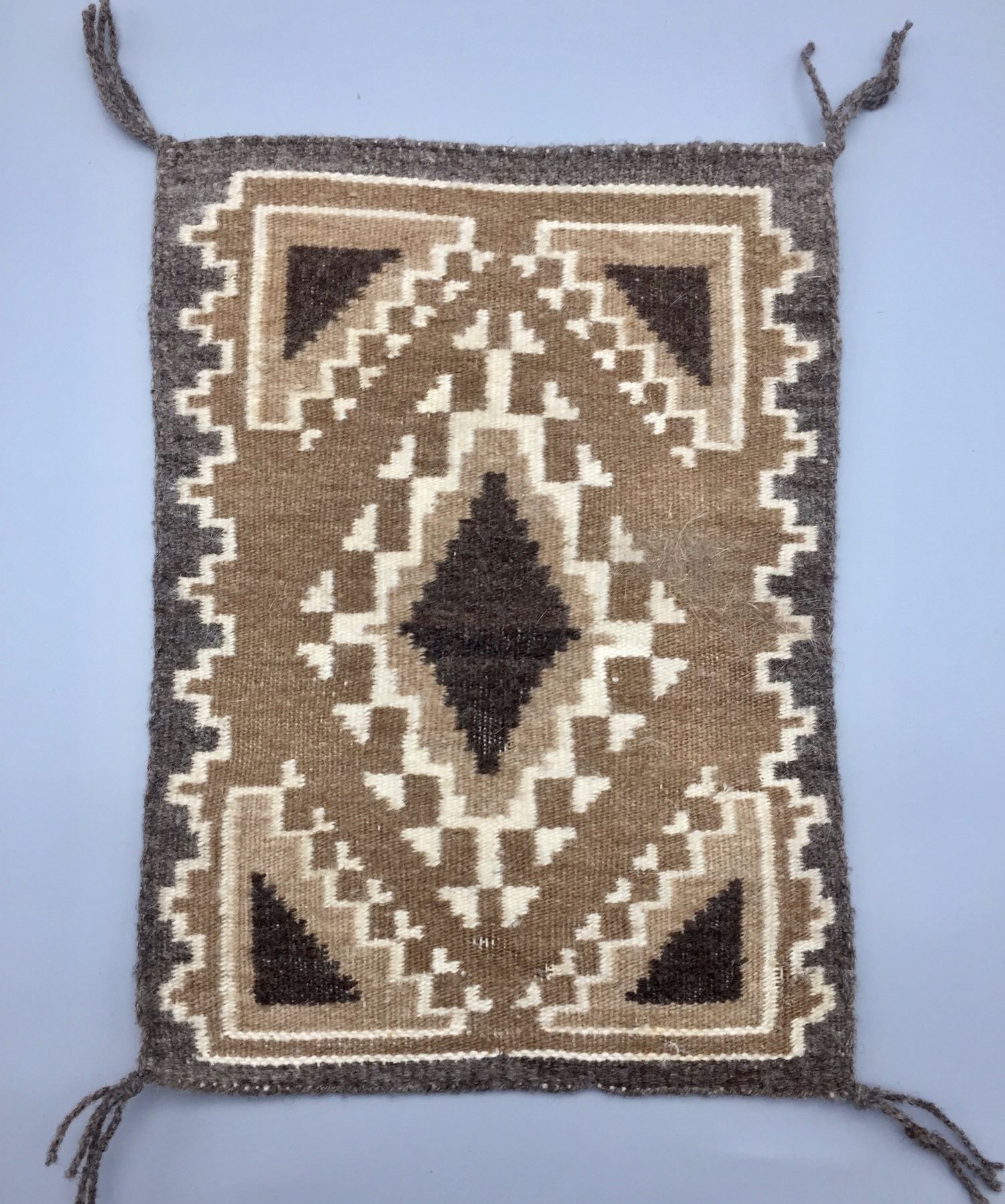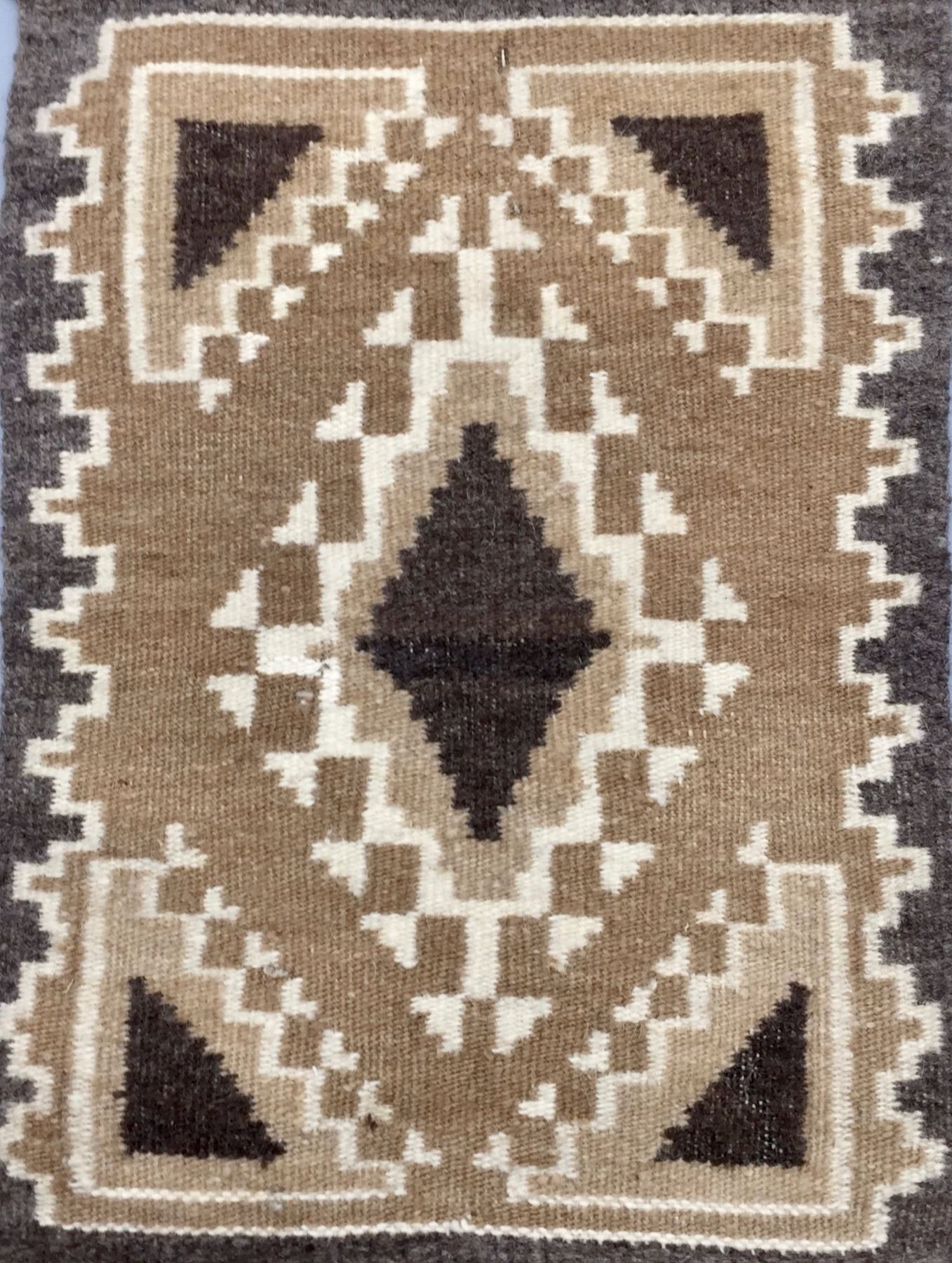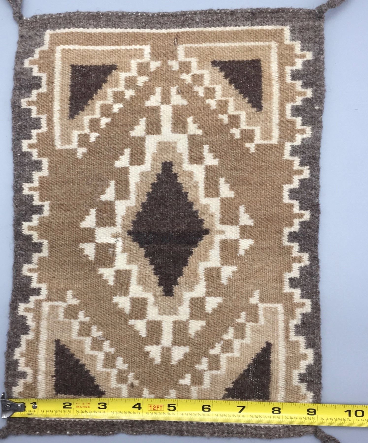 Maker: Unknown Navajo Maker Approx. Age: Fairly Modern Size: 9”w x 12 1/2”l. Additional Info: Mini Two Grey Hills Navajo Textile. Condition: Good for its age. Normal Wear Expected. Please look closely at the pictures - they are an important part of our description. Shipping: There will be a $5 handling / packaging fee for shipping this lot. The actual cost of postage will be added on top of that.