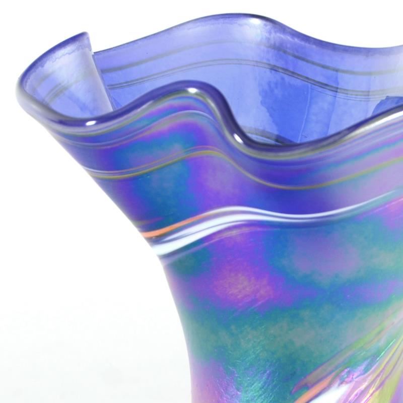 "Mini Ruffle Vase (Blue Rainbow Twist)" is a hand blown glass vase (second) from Glass Eye Studios. This piece contains ash from the 1980 volcanic eruption of Mount St. Helens. As each piece is individually handcrafted, the pattern in the glass may vary slightly from the image shown. "Second" means very slightly imperfect, but still great quality. Measures approx. 5.5" x 3" x 5.5".