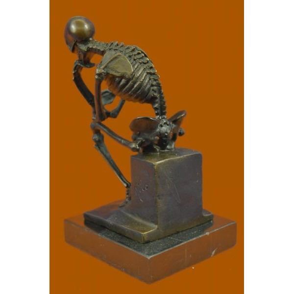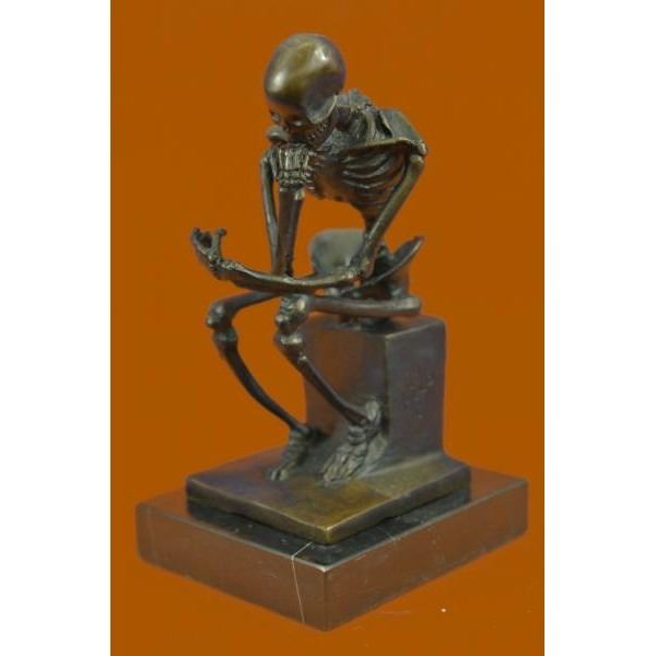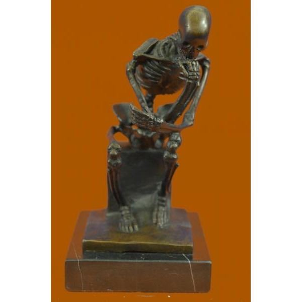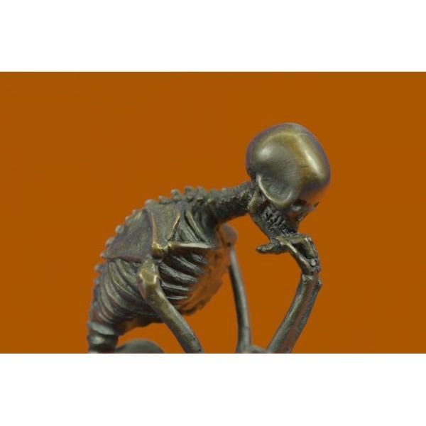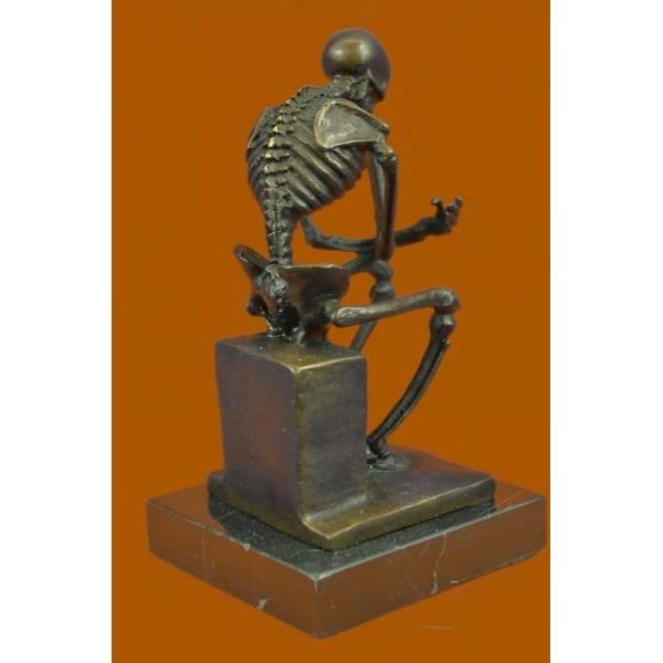 This sculpture is a skeletal version. Initially named the poet, the thinker statue was intended to represent Dante himself at the top of the door reflecting on the scene below. The thinker is depicted as a man in sober meditation battling with a powerful internal struggle. The unique pose with hand to the chin, right elbow to the left knee, and crouching position allows the statue to survey the work with a contemplative feel. A sculpture for fellow deep thinkers and testament to all too always think twice. The structure of the skeleton was done with great attention to detail. This sculpture was cast using the lost wax method and mounted on a marble base. Bronze dimensions with marble base: Height 6 X Width 4 inches. Weight: 2 lbs.