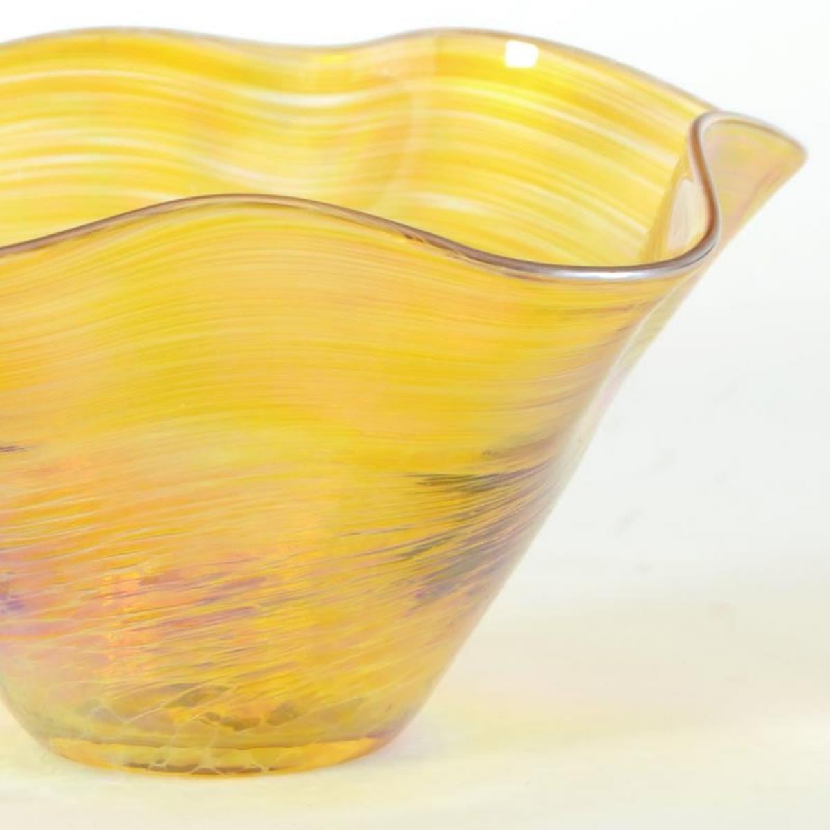 Mini Wave Bowl (Gold) by Glass Eye Studio. "Mini Wave Bowl (Gold)" is a hand blown glass bowl (second) from Glass Eye Studios. This piece contains ash from the 1980 volcanic eruption of Mount St. Helens. As each piece is individually handcrafted, the pattern in the glass may vary slightly from the image shown. "Second" means very slightly imperfect, but still great quality. Measures approx. 6" x 3".