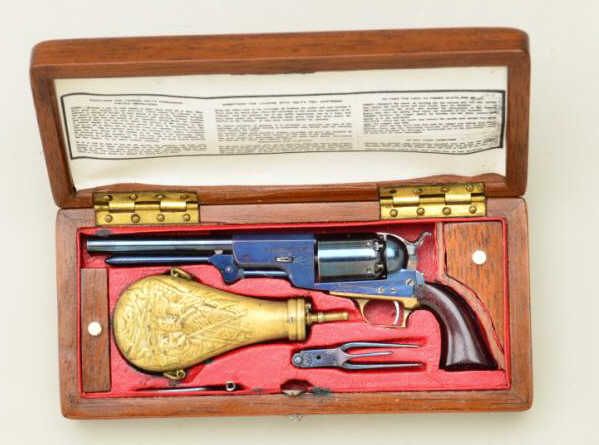 Miniature 1/3 scale Colt walker pistol by Weston cased with accessories, in excellent condition. Weston made these exceptional miniatures in the 1950’s and they show accurate detail and markings, an example ismarked “D company 46”. Condition is fine with couple of scratches, miniature bullets are retained. Very desirable. Est.; $2,500-$5,000.
