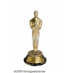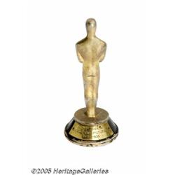 <B>Miniature Academy Award (Columbia, 1935)</B></I> (Approx 6 inches Tall). This is an amazing little replica of the early full size statuettes that were awarded by the Academy. This is marked on its front base plate with "Academy of Motion Picture Arts and Sciences First Award, Columbia Pictures for the Best Picture of the Year." On the back base plate it is marked "15th Anniversary Columbia Pictures, 1920-1935." We believe this to be some sort of gift or table favor given at an honorary dinner for Columbia Studio's fifteenth birthday. This was just at the time that they swept the awards with their Best Picture, "It Happened One Night." This lovely little statuette has wear to the lower base where bits of its black finish has come off. The gold metallic finish shows wear from handling. Another copy of this same award was sold in auction recently for close to $2000. This would make a wonderful addition to your Academy Award poster collection or to just sit on your desk. You would always be able to say that you too had an Academy Award at home. Fine- condition.