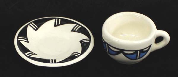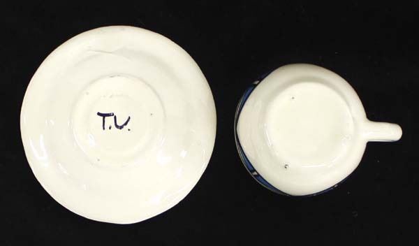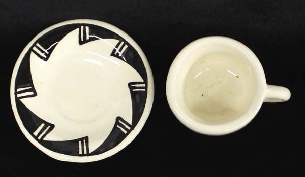 Miniature Native American Acoma Painted Ceramic Pottery Cup and Saucer, saucer measures 3''D, artist's initials T.V. on the bottom of the saucer