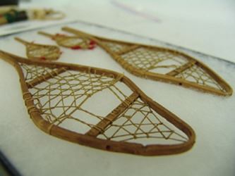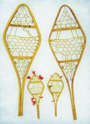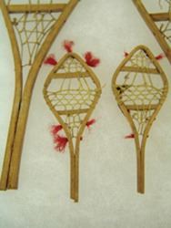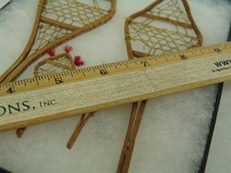 Great pair of vintage, hand crafted miniature northeastern style snowshoes, in adult and child sizes. Very good condition, nice patina. In small display case. Ca. 1970s. Largest 6-1/2" long.