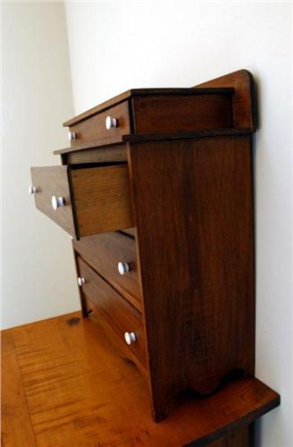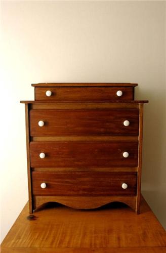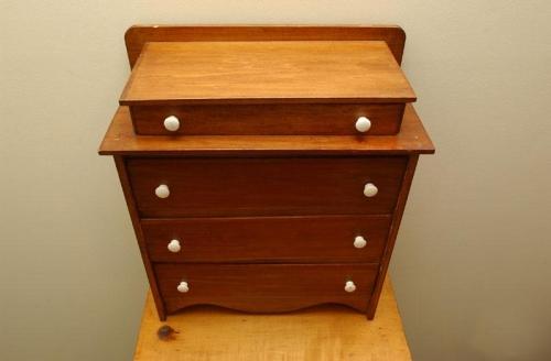 Child sized pine cabinet with 4 drawers and white porcelain handles, several wood chips on bottom drawer. 20" by 17 1/4" by 8 1/4"