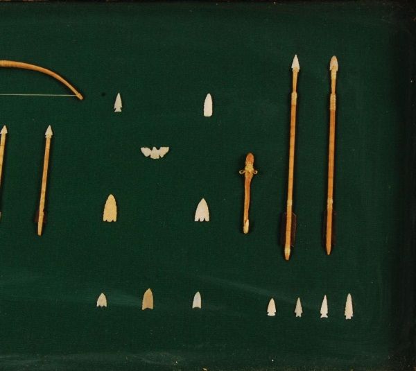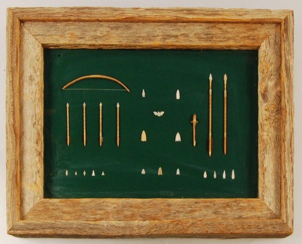 Miniature Prehistoric, Archaic, and Paleo weapons sets. All points hand knapped of Edwards chert. All bindings are deer sinew. Bow is hand cared Juniper. Atlatl and darts 1200-800 bp. Late Prehistoric bow and arrows 500-1200 bp. All Handmade by Central Texas artist David Thurman. Signed and dated 2006 on back. Frame measures 16 1/2" x 12 1/2".