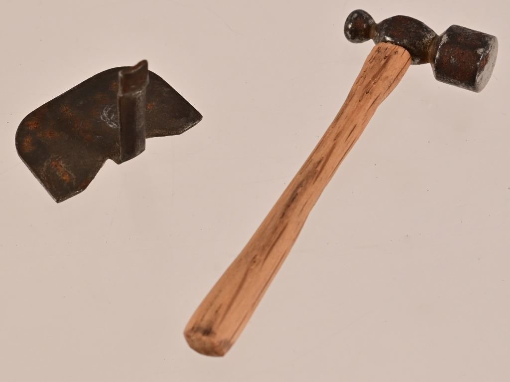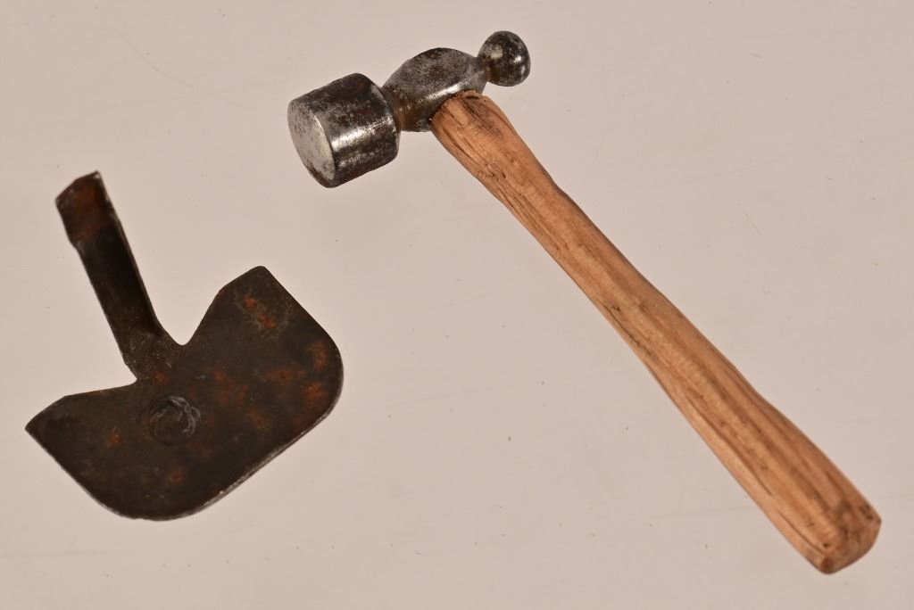 Ball Peen Hammer with wooden handle 2 3/4" x 1". Mini Farmers Hoe with no handle. 1" x 3/4" x 1".
