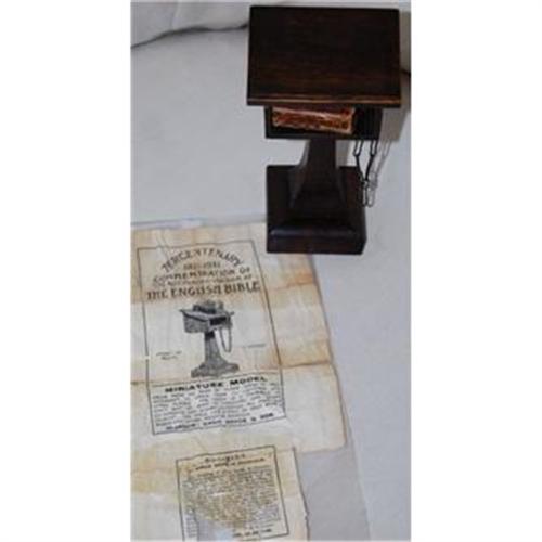 Antique Miniature Bible Chained to stand. This piece was to commemrate the 300th anniversary of the authorized version of the English Bible. Because the bible was so rare in olden times, it was necessary to chain them to the lecterns. This is, of course, a miniature model of that. There is also the advertisement for this piece. The bible looks to have been restored and the first few pages seem to be glued together. However, it is still intact. The advertisement has a few tears from wear. See photos.