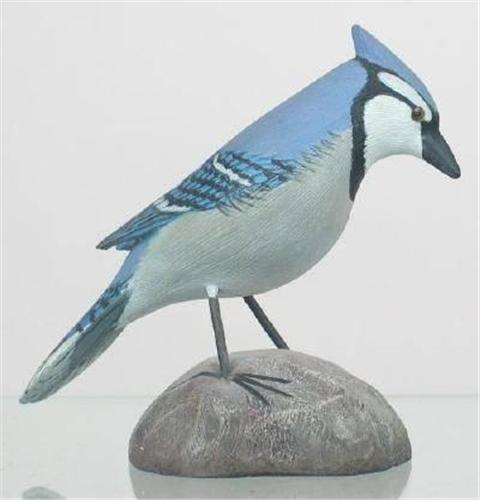 Miniature Blue Jay by Jess Blackstone. "Blue Jay", # and typical JB signature along with collection # in a circle in pencil on the bottom of the mount. XOC. (decoy)
