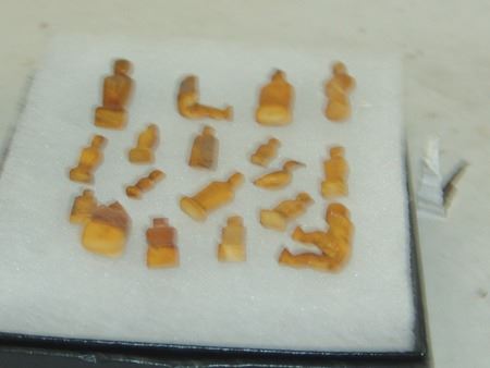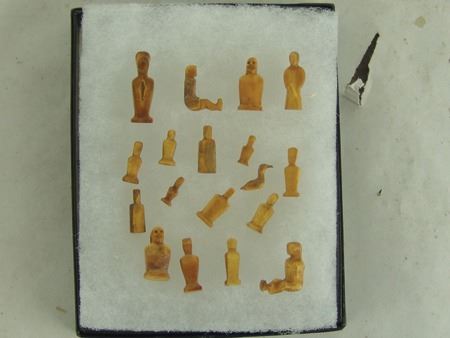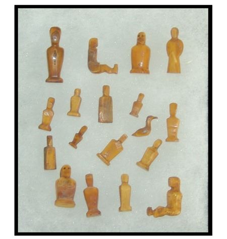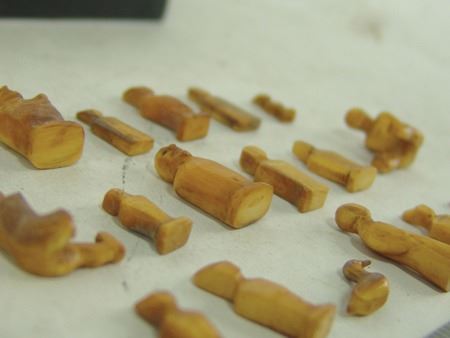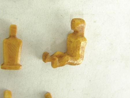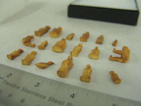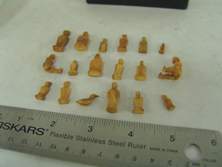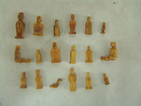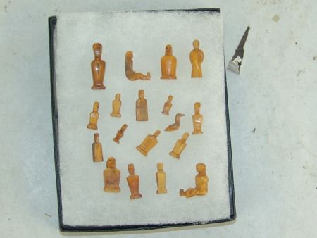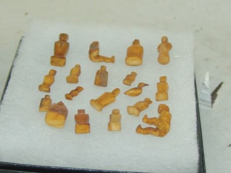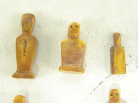 Mid 1900s, A group of 18 tiny hand carved bone or fossilized ivory figures, mostly human but one a bird or duck. Probably Eskimo or Arctic made. Great patina, very good condition, one missing a leg. Largest 1"