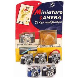 € 130,- "C. M. C. Camera" (blau), "Click", 2 unterschiedliche "Hit", "Walklenz" und "Colly", in Originalverpackung, alle mit Taschen. 6 hit-type subminiature cameras, among them a blue "C. M. C. camera" and a "Colly", packed, all with cases. - (2-3/2-3) - € 200/250 - (127/6)