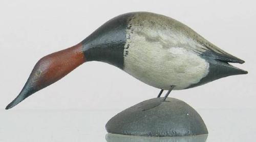 Miniature Canvasback drake feeder by A. E. Crowell, East Harwich, MA in XOC. Early ink stamp on the bottom of the base reads " A. E. Crowell, MFG, E. Harwich, Mass." There are four pin point white dots of paint on the surface. (decoy)