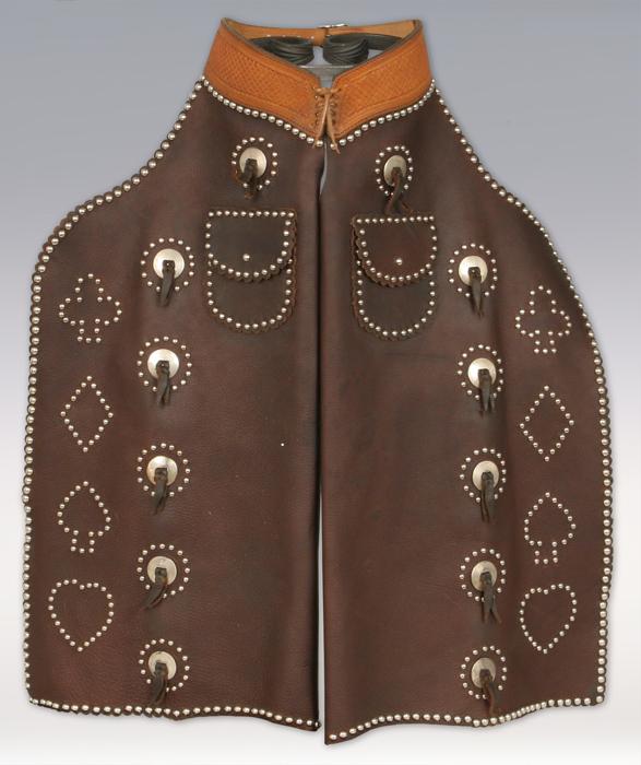 Miniature Card Suite Chaps. 39" x 35". Andress Schneider Maker. 700 spots and 12 sterling conchos. Contemporary. As cute as they can be. Condition Report: Fine condition.