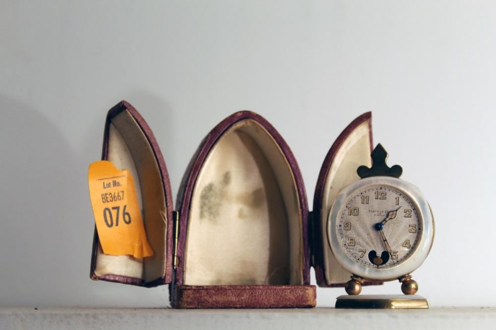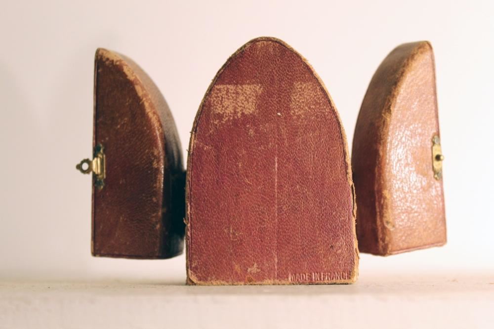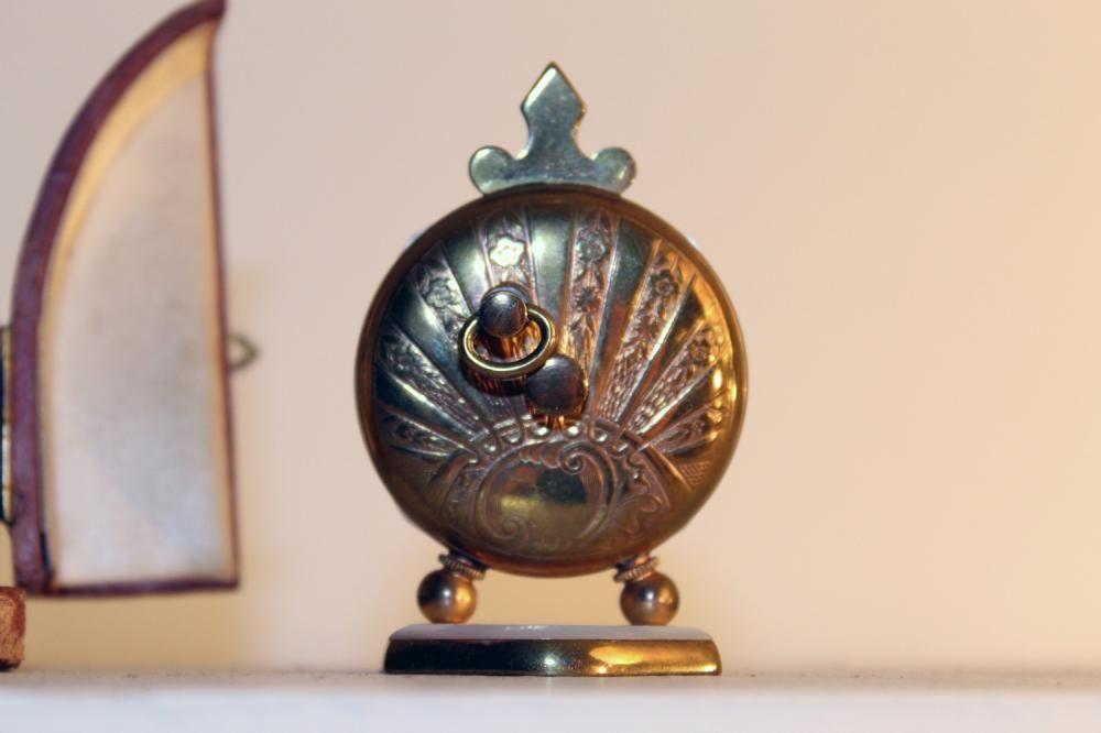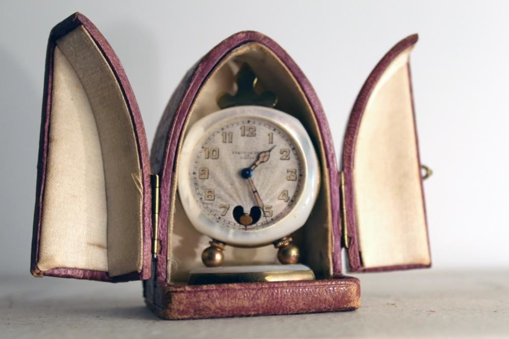 Miniature carriage clock with case. Made in Paris, France. Approx. 3 inches tall.