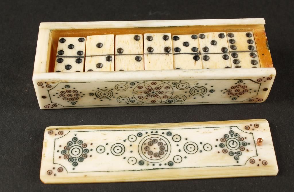 Ornately designed box with (28) scrimshawed dominos each 3/8" wide x 5/8" long x 1/16" thick. The box is 7/8" wide x 2-1/4" long x 5/8" tall. Unique piece.