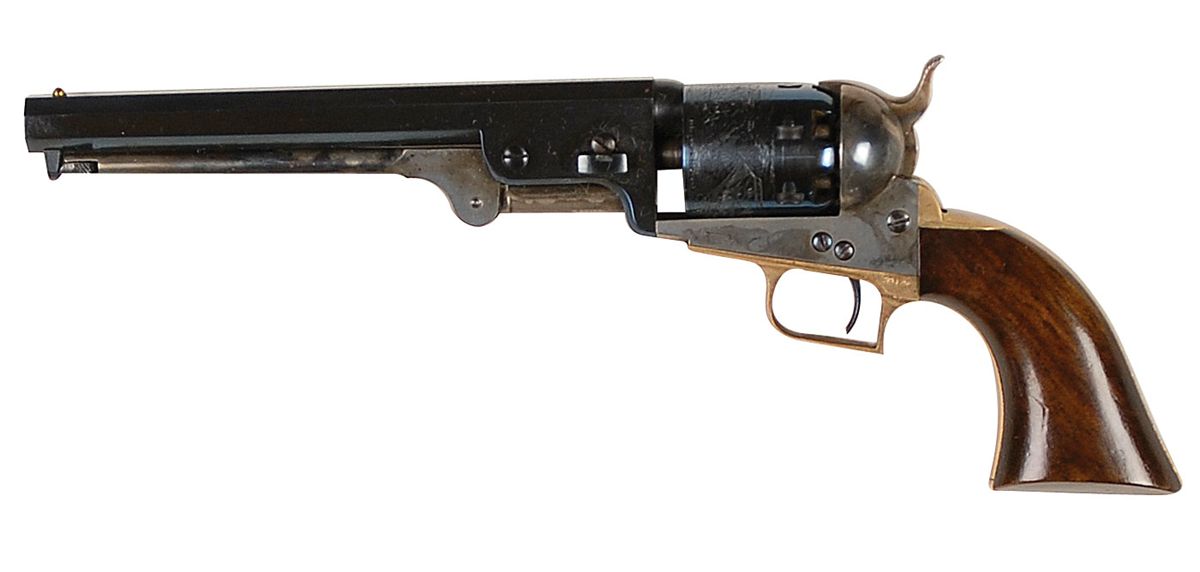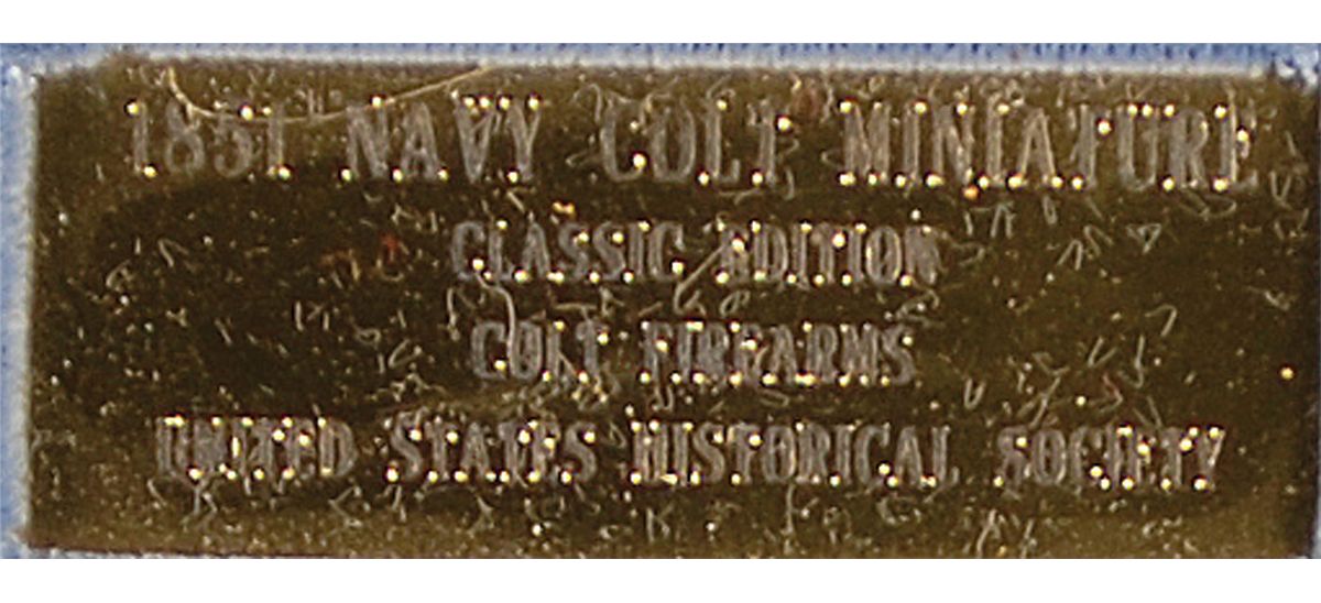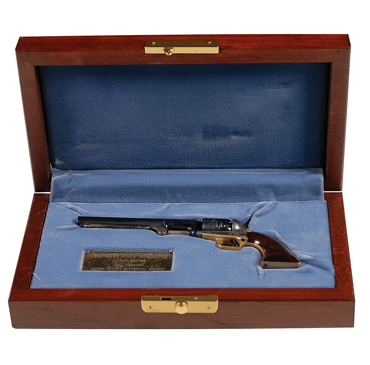 This is a beautifully made copy of a Second Model 1851 Navy with a square-back trigger guard. It is just 6? in overall length with a 3.5? octagonal barrel, serial #111. The frame, hammer, and loading lever are case colored; the barrel and cylinder are blued; the grips are polished brass, and the one-piece walnut grip is piano-finished. The mechanism functions like the original, but of course this does not actually fire. The mahogany case has a couple of small blemishes, the revolver is like new.
