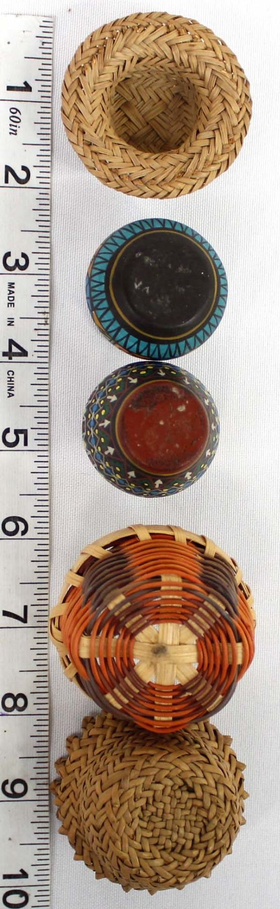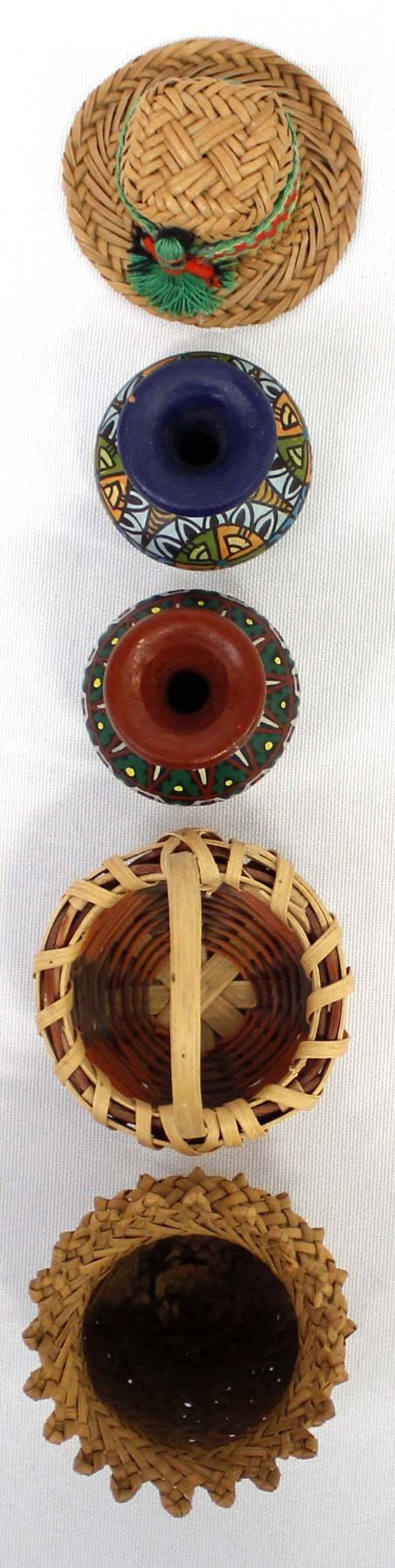 Miniature Collectibles, includes 1. Tarahumara Basket 2. Tarahumara Hat 3. Native American Cherokee Single Handled Basket 4. Two Miniature Pottery Vases, largest measures 2''H