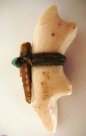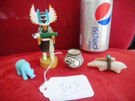 Four miniature items to include Acoma pot which is signed RLS, Hopi Eagle Kachina signed AY. Kachina is holding quiver of arrows, Turquoise bear carving with a shell fish in mouth and a Fine Zuni Fetish with Arrowhead, turquoise and coral beads on back. Shipping $16.50