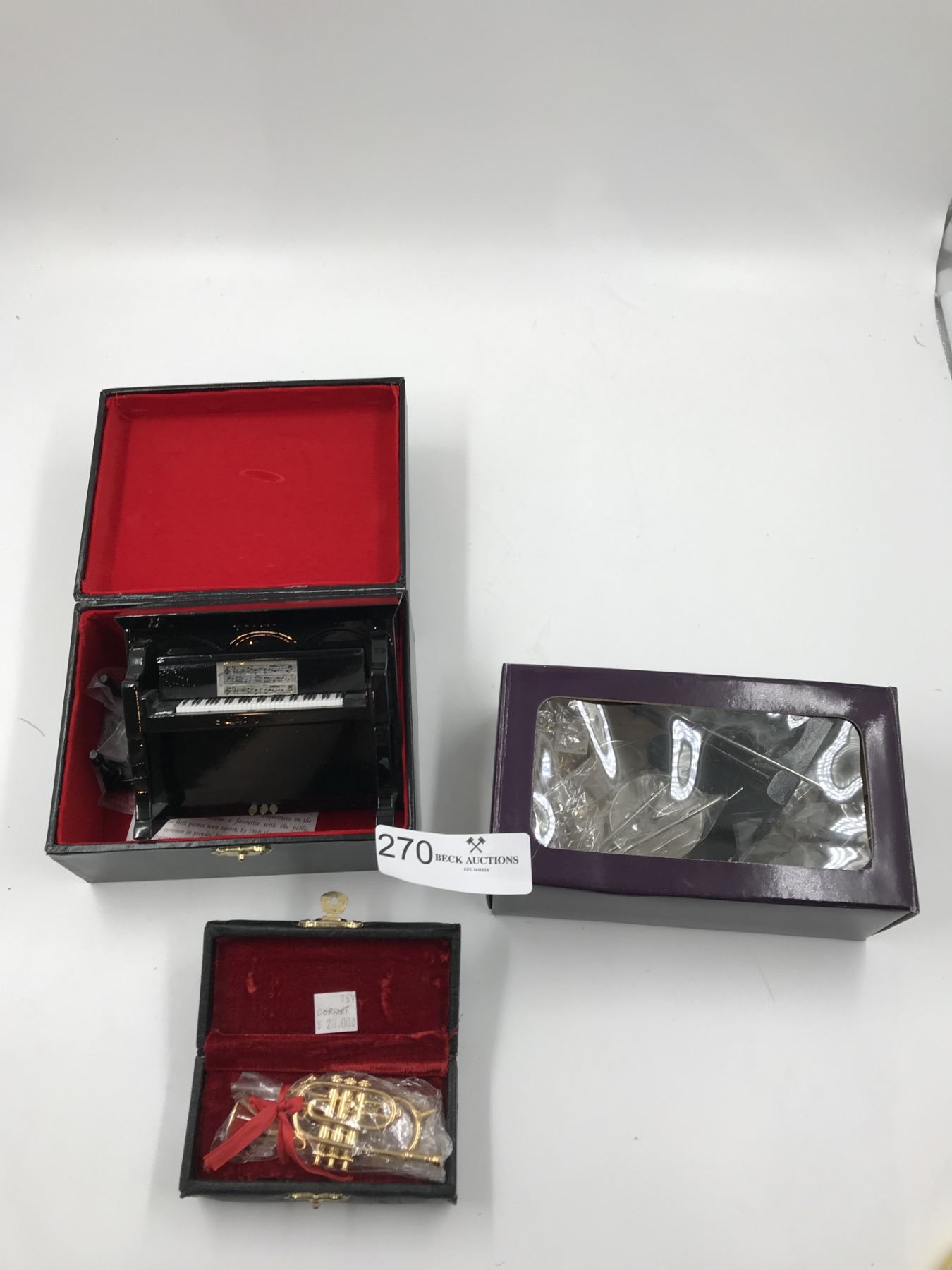 Miniature Cornet, Music Box Piano, and Box w/ Tuba Instrument Pieces