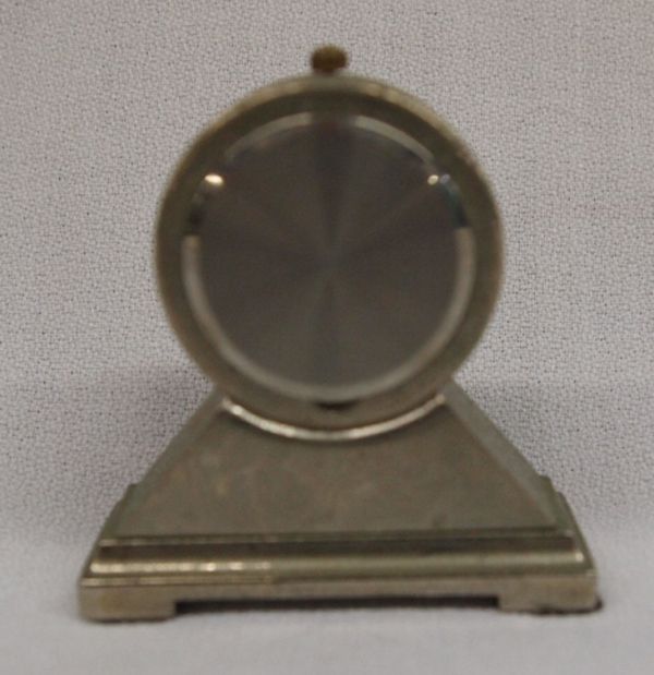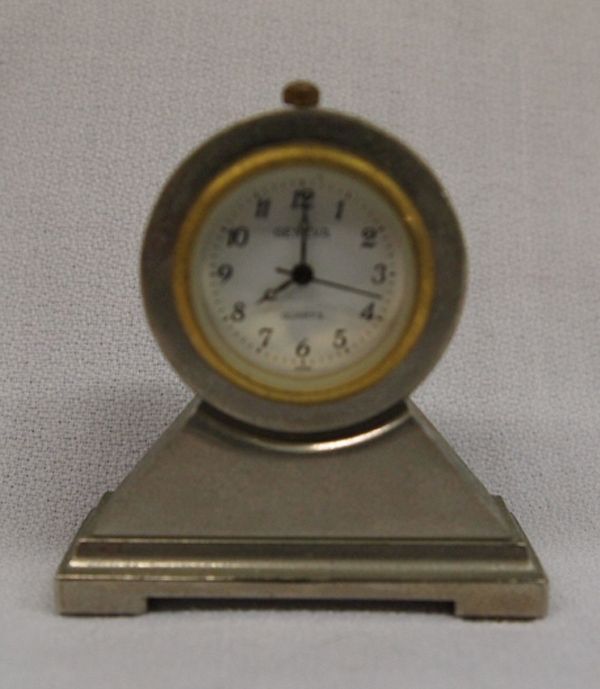 Up for auction is a miniature fully functioning mantel clock just measuring a wee 2'' high x 2''L x .75'' Deep. It's a sweet little clock made of mixed metal. It shows Geneva and Quartz on the clock face an takes a battery. Can adjust time from knob above clock face. It has a silver body and trimmed in goldtone around clock face. What a sweet little piece if you collect miniatures. This will make a wonderful addition to your collection.
