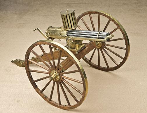 Miniature Gatling gun by Furr of Utah, model 1874, with canister feed. .12 caliber non-firing, but fully operational. Dated September 26, 1980, gun #9. The body of the Gatling measures 9-1/2”, the barrels measureapprox. 6”. The gun, its carriage, and magazine, are finely hand-made and would function with .12 caliber dummy rounds, a number of which were supplied with each gun and now are not available. The condition isfine to excellent, some slight handling and needs a cleaning only. Our information is that less than a dozen of these were produced as they were very difficult to hand-make in this small size. The carriage wheels measure9” in height. A great non-firing display piece by a well-regarded maker. No registration required. From the Robert Petersen collection. Est: $4,000 - $8,000