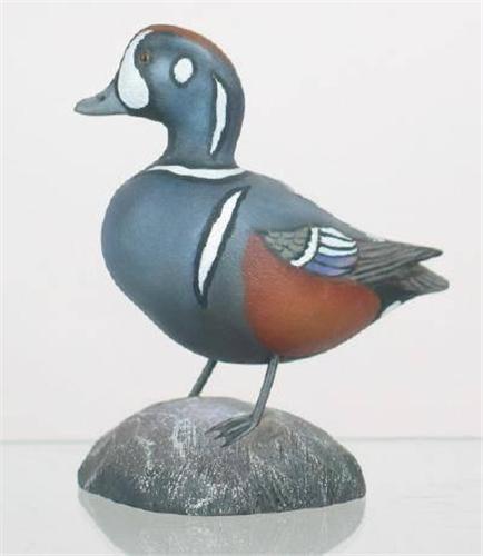 Miniature Harlequin Drake with a turned and exceptional paint detail by Jess Blackstone. "Harlequin Duck", #659 and typical JB signature along with collection #5 in a circle in pencil on the bottom of the mount. XOC. (decoy)